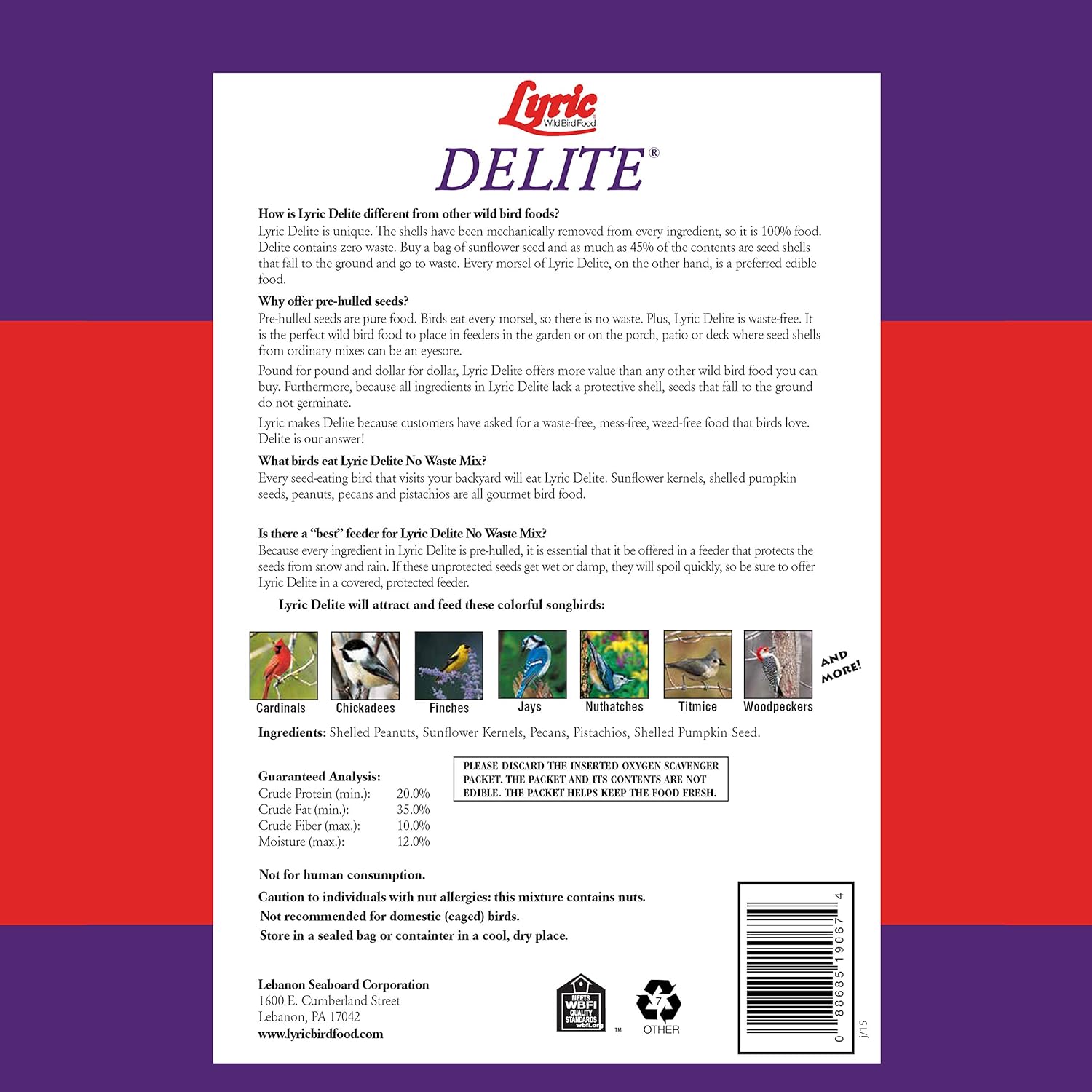 Lyric Delite Wild Bird Seed - No Waste Bird Food Mix with Shell-Free Nuts & Seeds - Attracts Buntings, Chickadees & Finches - 20 lb bag