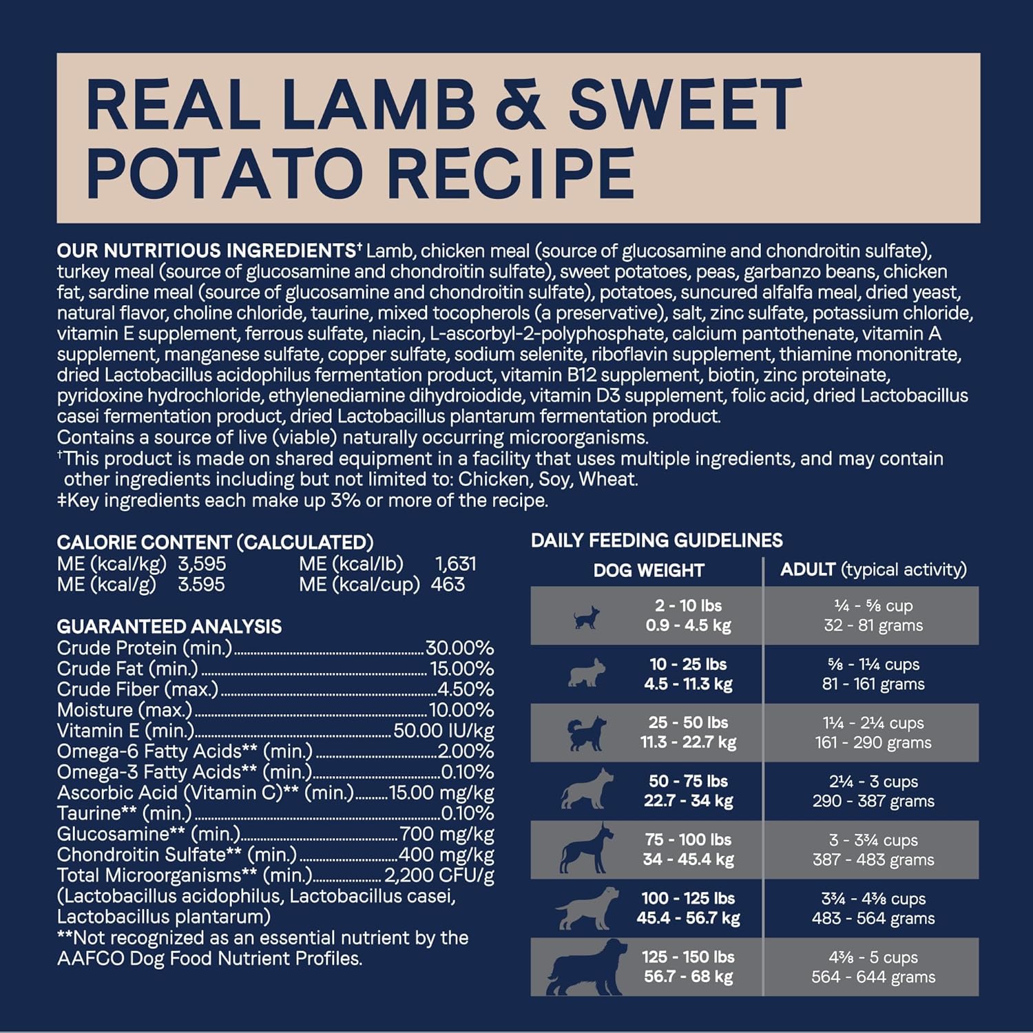 - Real food ingredients for the taste your dog will love. Crafted with real lamb as the first ingredient, paired with whole ingredients like peas, sweet potatoes and garbanzo beans
