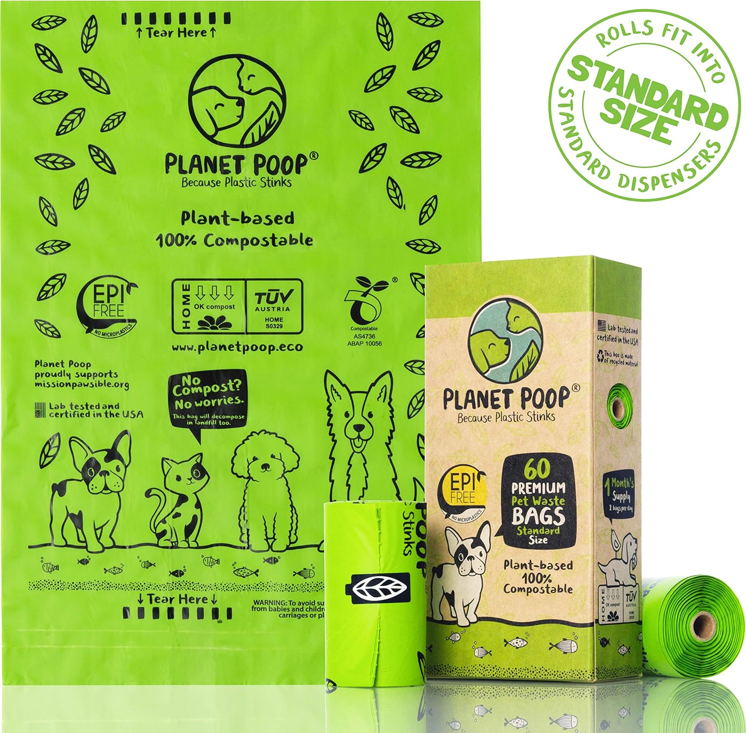PLANET POOP Home Compostable Dog Poop Bags on Refill Rolls, 60 Un-Scented Pet Waste Bags, Thick Leakproof Plant-Based Doggy Bag, Cat & Dogs Supplies