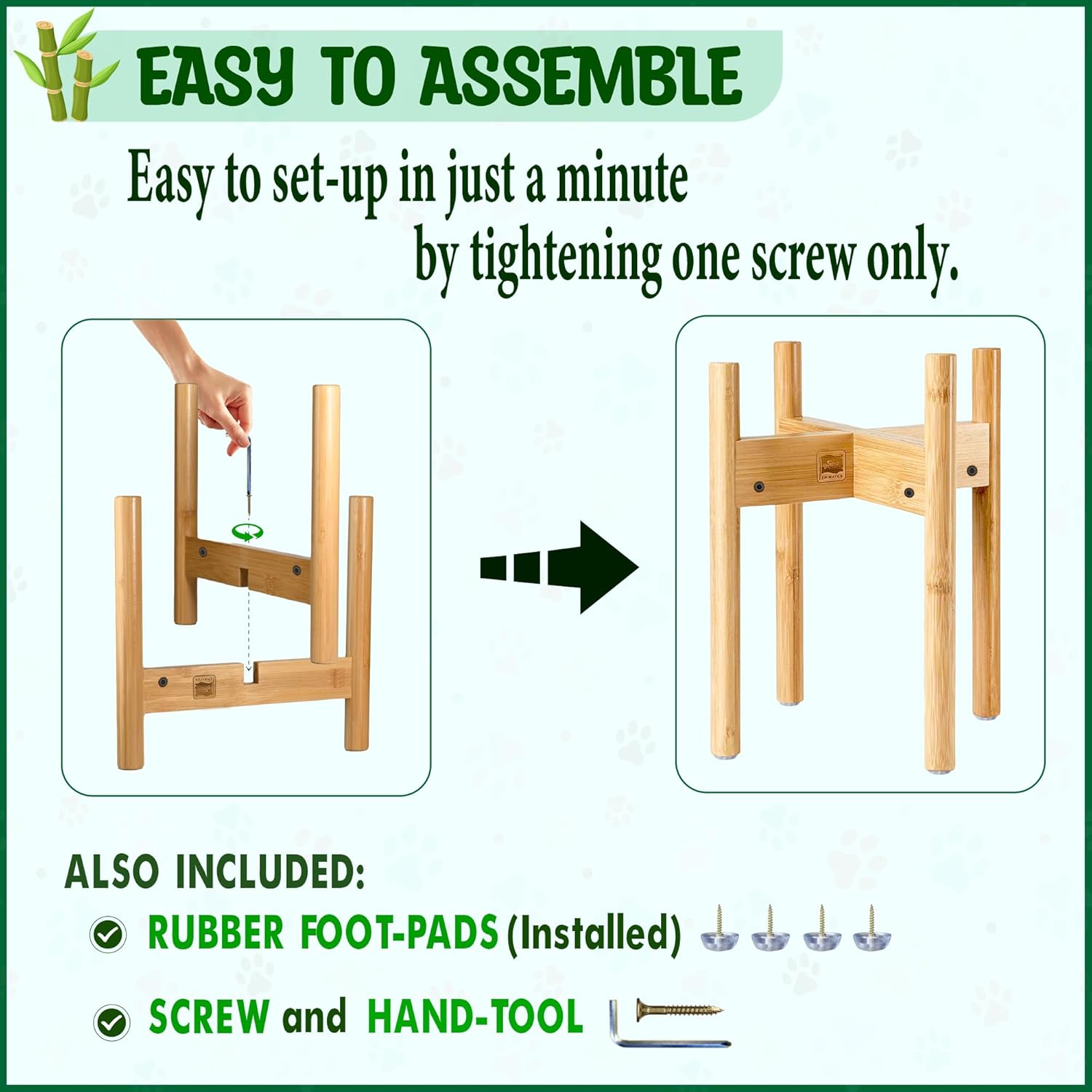 - Raises Bowl to Around 14" High – When a bowl is placed on the bamboo stand, the height of the elevated bowl will become approximately 14 inches tall from ground to bowl rim. Please see photos for measurement and set up. [Bowls shown in the photos are sold separately.]