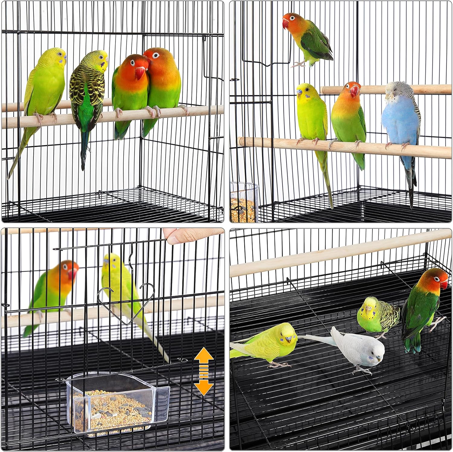 - Safety door design: The main door can be opened in two ways for you to take in or out different things, and you can use two supplementary doors for changing seeds and water without your parrots sneaking out unexpectedly