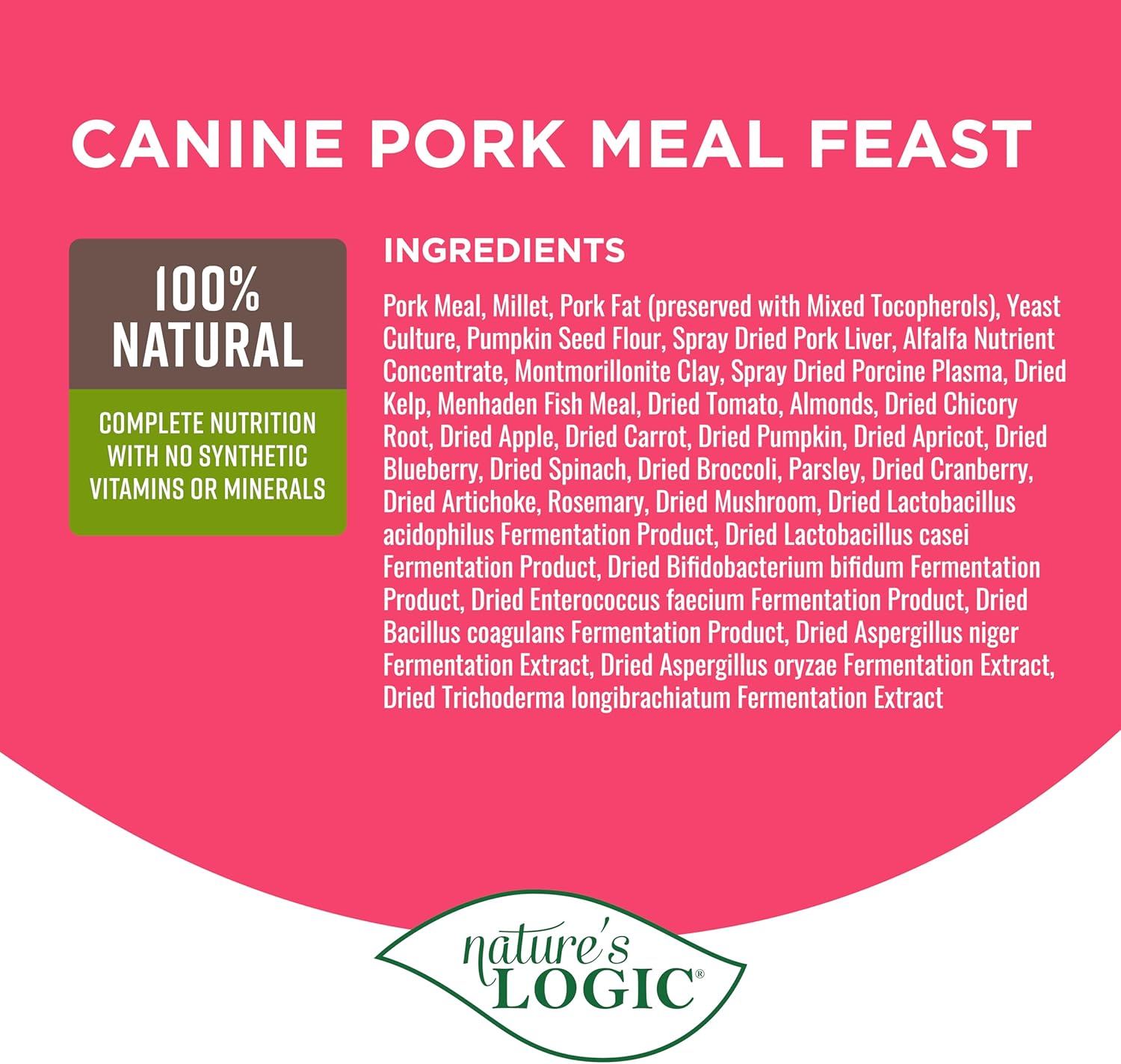 NATURE'S LOGIC Dry Dog Food - 100% Natural - No Synthetics - for All Ages, Sizes, Breeds - Free from Common Allergens, High Protein - Pork Meal Feast, 25lbs