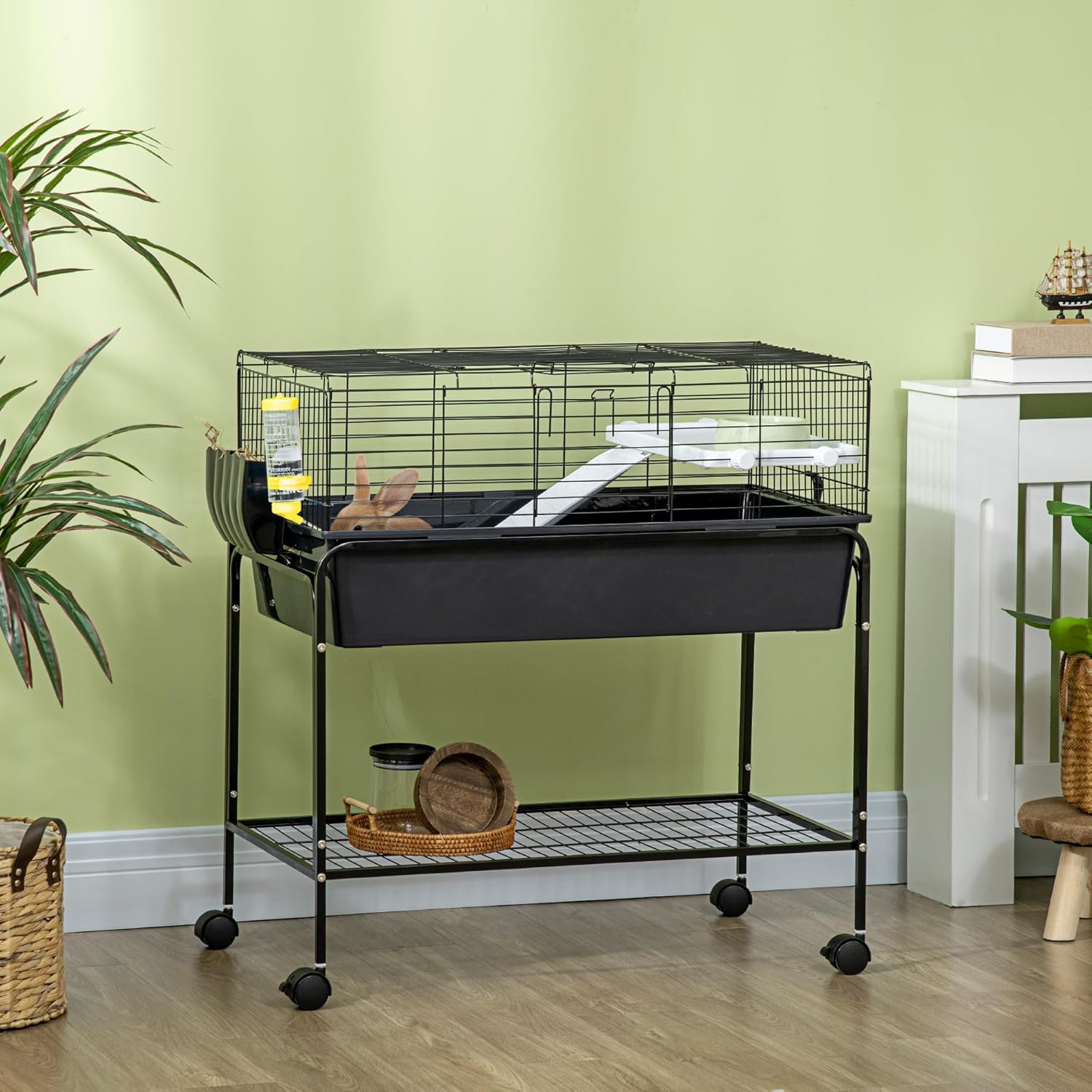 - Elevated Platform & Pet Accessories: This pet cage comes with an elevated platform to create a private space underneath. A food dish, hay feeder, and water bottle are included.