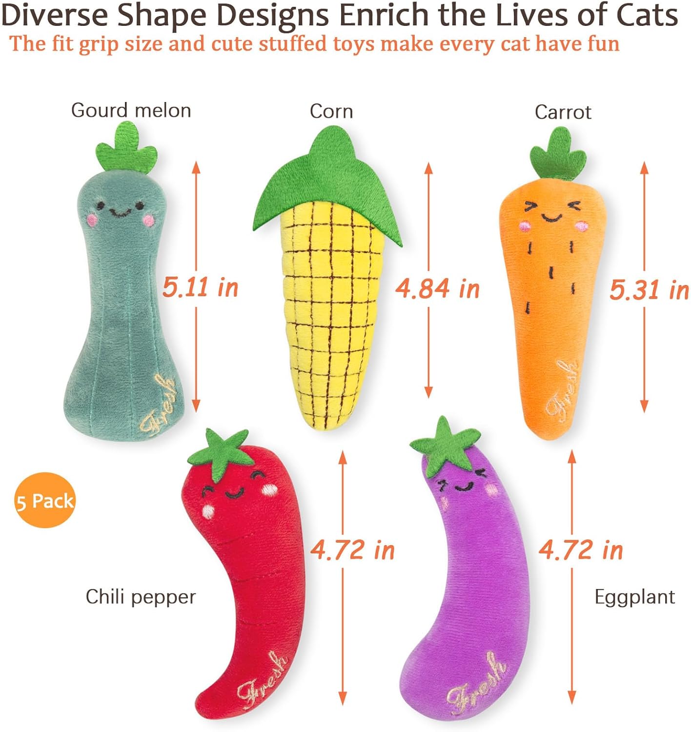 - Vegetables Theme Fun Kitten Toy: 5 Colors and shape, catnip carrot, pickle, corn, chili, eggplant, assign toys of different colors to track your furry baby's activities. Your cat will love this fun toy, every pounce and bite can increase their playtime
