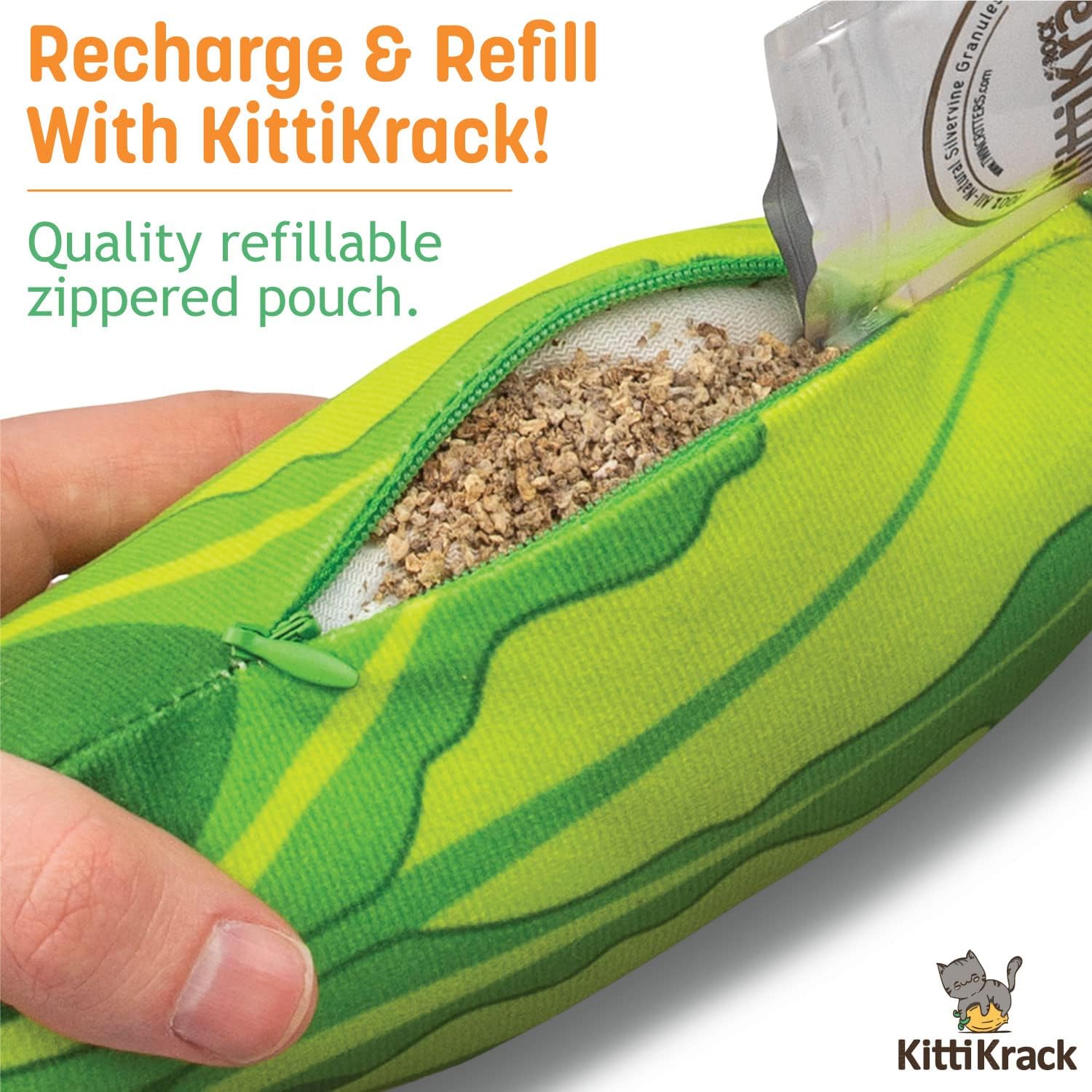 - Refillable Cat Toy: Each KittiVeggi plush cat toy is able to be refilled with TWINCRITTERS KittiKrack Rock refills so your furry friend can keep the fun going! Our silver vine cat and kitten toys are a great compliment to regular cat treats and are purr-fect for playing, teething, and can stand up to the signature "kitty kicking".