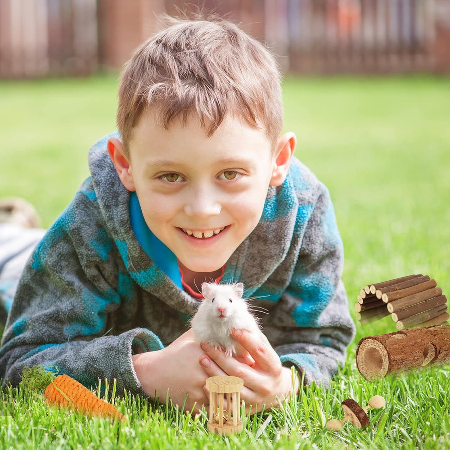 - 【8 Modes of Wooden Chew Toys】The hamster toys and accessories set includes 2 Hamster Bridges, 1 Tree Trunk Tube, 1 Watermelon Ball, 1 Bell Roller, 1 Pine Cone, 1 Unicycle and 1 Carrot. The whole set offers a cool playground for hamsters,dwarf hamsters,rats,guinea pigs,parrots,chinchillas,gerbils and bunny rabbits. Pefect small animal toys for cages and playpens.