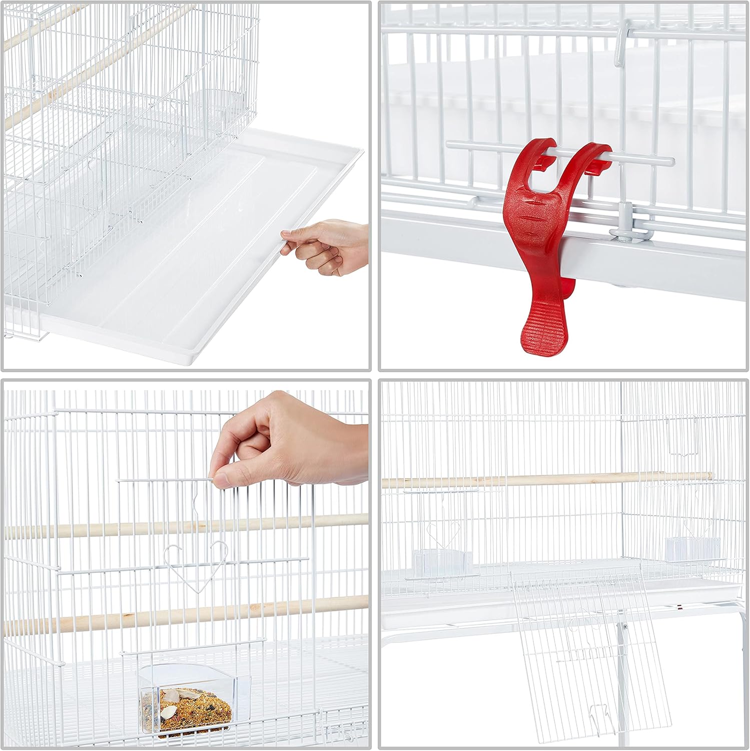 - Clean with ease: The pull-out litter tray makes cleaning much easier for pet owners. The large tray catches most of the bird droppings and spilled seeds, while birds will not directly touch the tray thanks to the grate above it