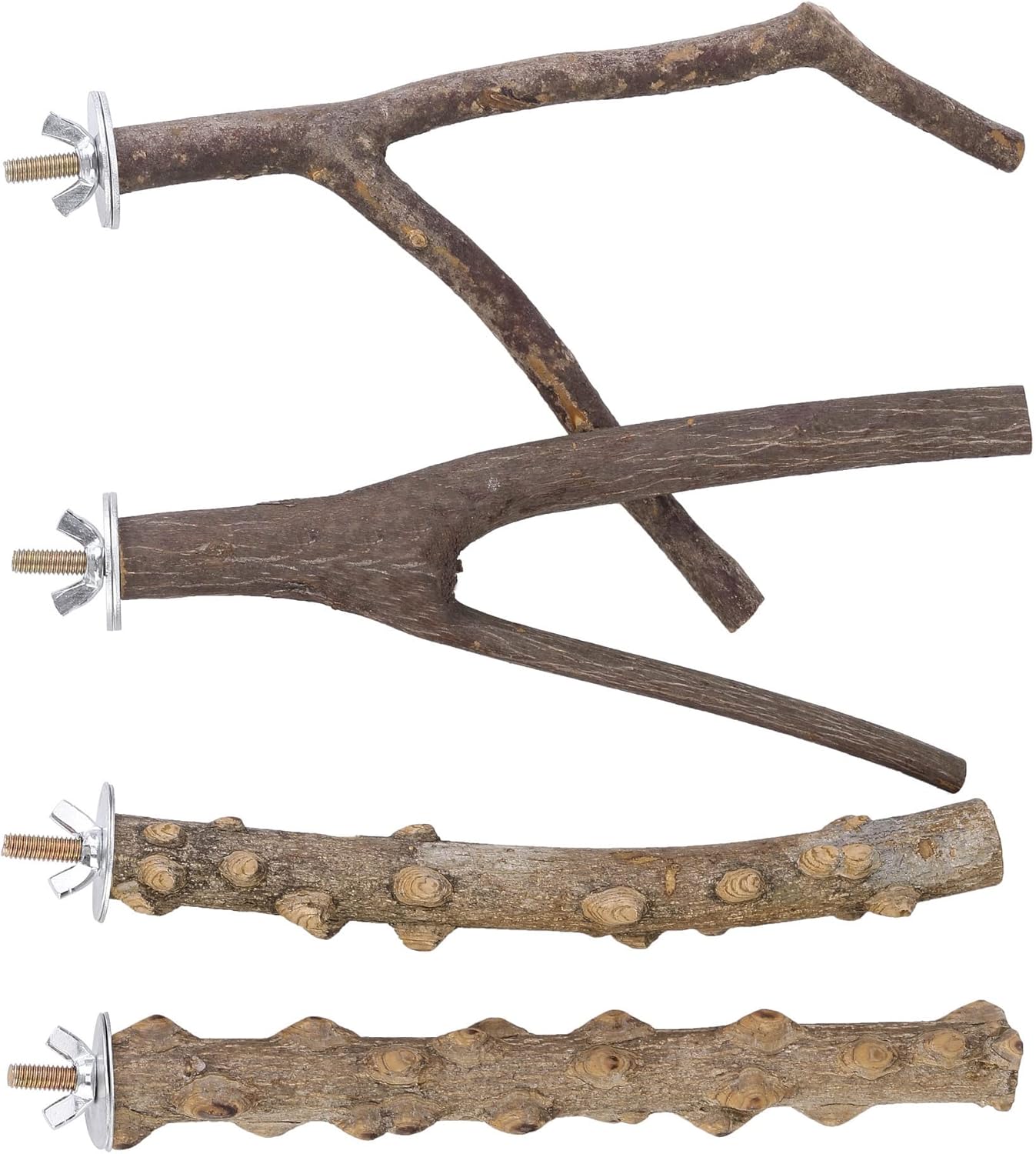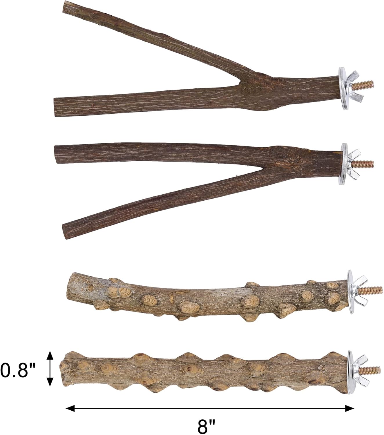 - 【Size】: Y-shaped bird perch*2, straight-shaped bird perch *2, approx 7.9” long and 0.8” in diameter. Each wood perch is able to accomodate 3-4 birds at the same time, perfect for budgies, conure, parakeets, cockatiels, lovebirds or other small birds.