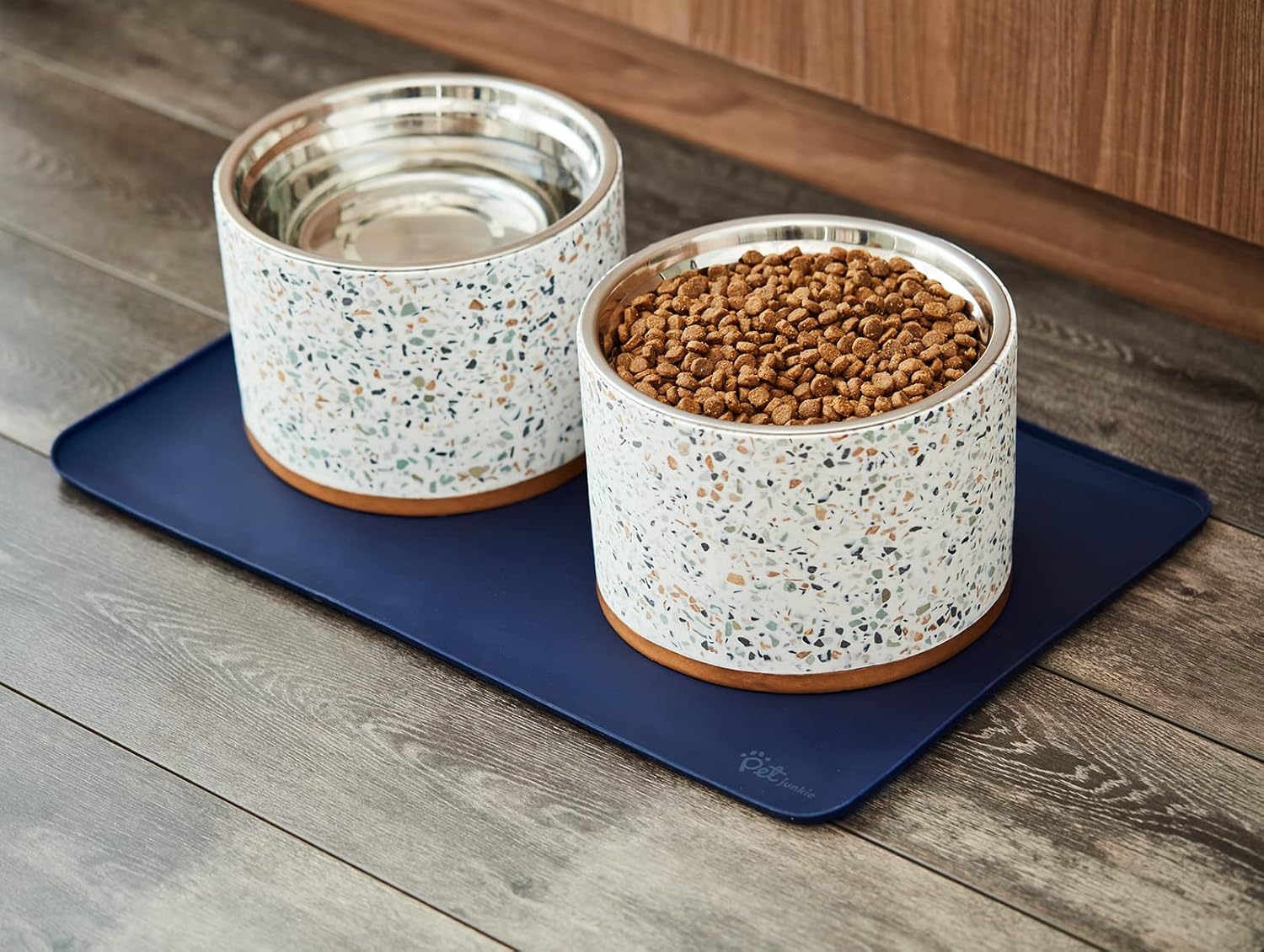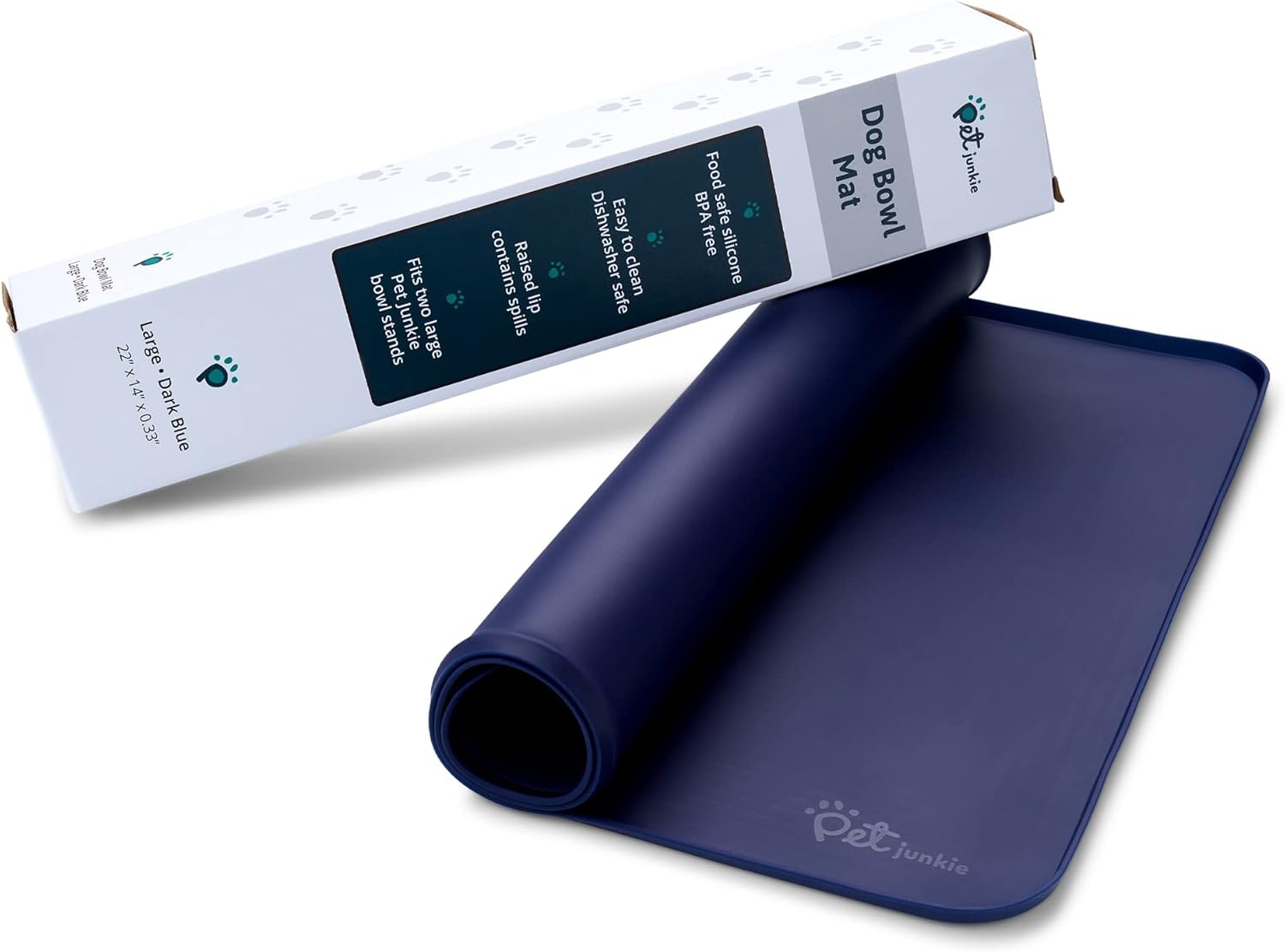 - LARGE AND SMALL PETS: 22" x 14" x 0.33" - This dog food placemat fits two Pet Junkie bowl stands or comparably sized pet dishes. Perfect size for a food mat for dogs or a cat feeding mat.