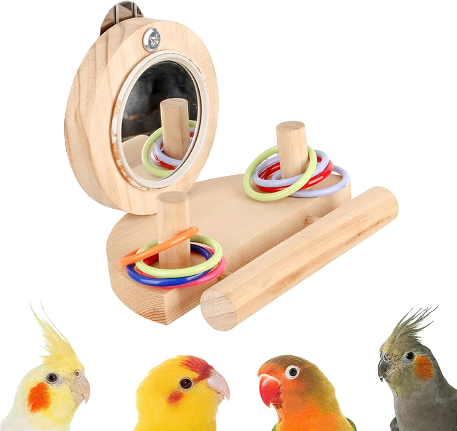 - 【WHAT YOU GET】Our bird mirror toys set includes 1 round mirror, 1 wooden bird platform perch and bird stacking toy(8 pcs plastic stacking ring ). This versatile design not only meets the daily play needs of pet birds, but also enhancing her curiosity, exercising her enthusiasm.