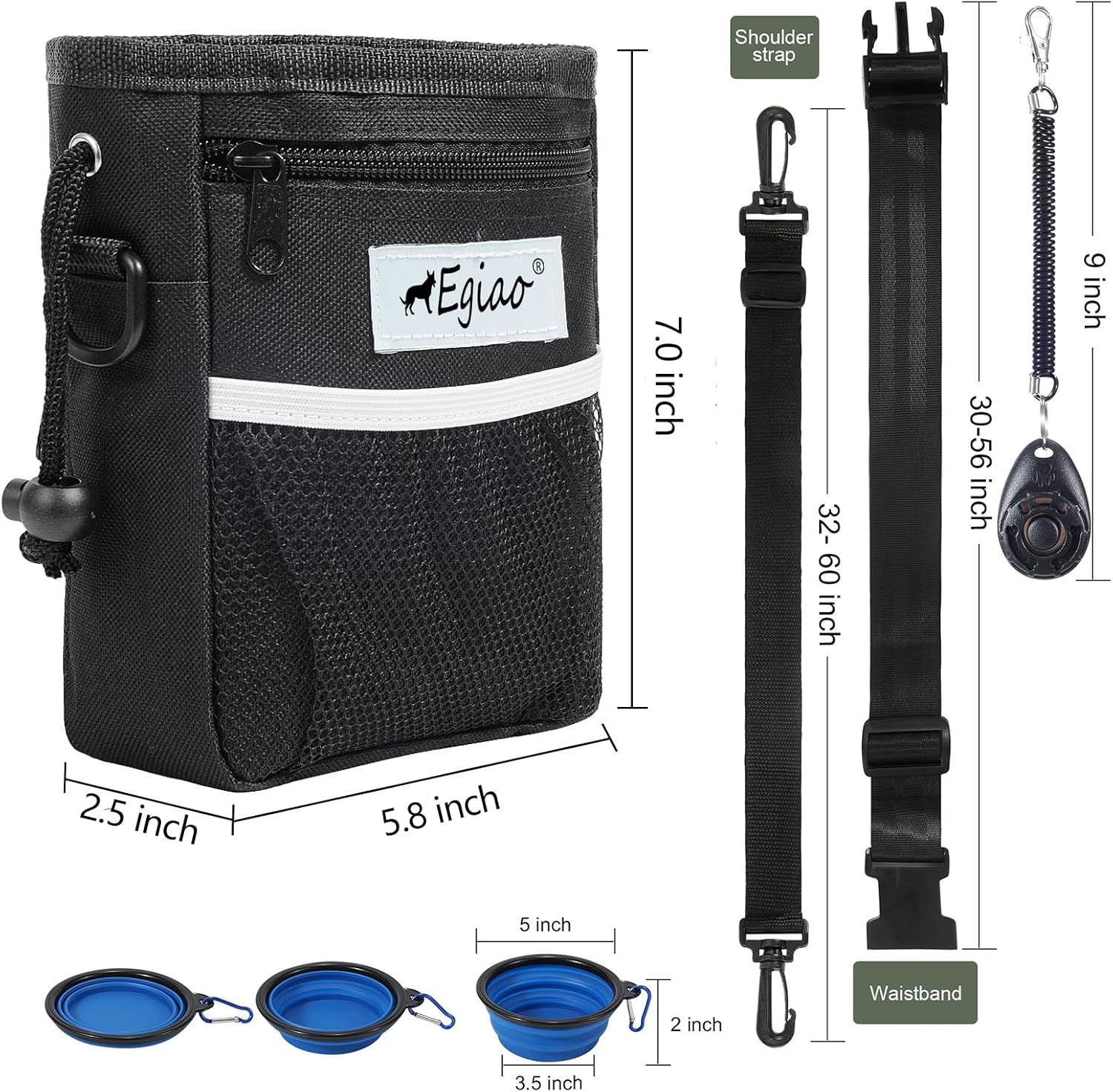 - 🐾5PCS Dog Training Kit: Includes a multifunctional dog training pouch, a collapsible dog bowl, a training clicker, a waist strap, a shoulder strap