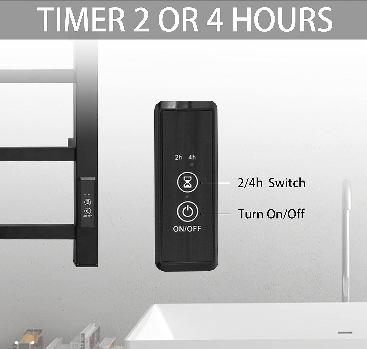 - Timer & LED Indicators: The towel warmer has a built-in timer of 2h or 4h with a visual LED indicator. Press the 2 or 4 hour buttons will dry your towels, and then it will automatically shut off itself when time is up.