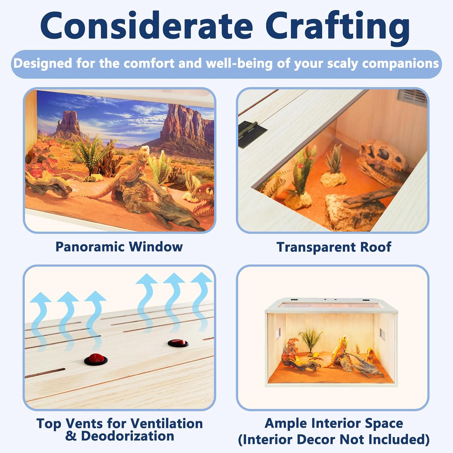- 【Premium Reptile Habitat】Designed for reptile enthusiasts, our enclosure offers a spacious interior for your reptiles to roam freely. The transparent front and top acrylic panels provide an unobstructed view, while top vents ensure proper air circulation. Please note: This tank is not suitable for holding water and is available in 4 size variants!