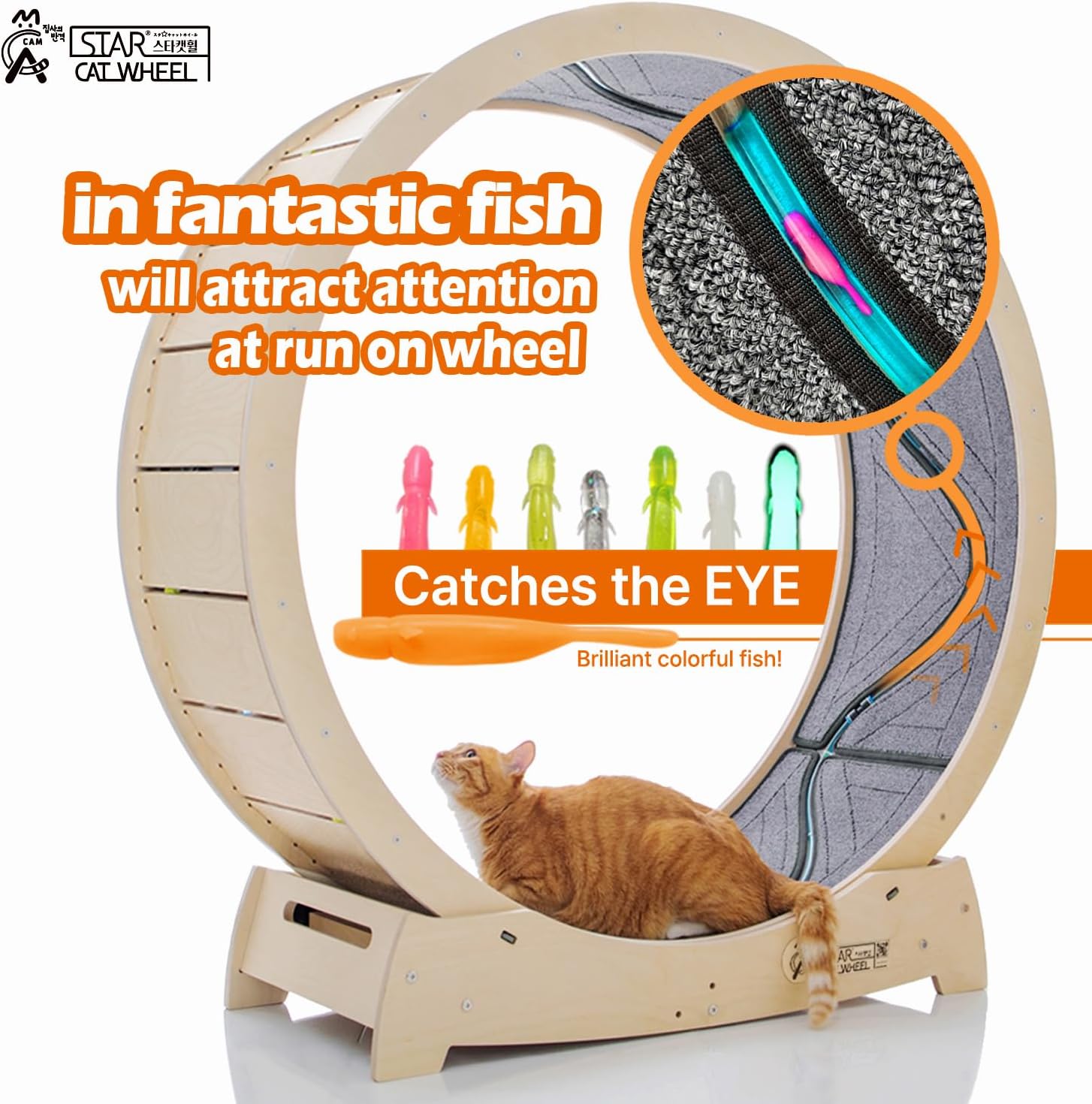 - NO MORE BORED: Moving fish will attract attention of your cats and make them keep running on the wheel. (US Patent 11627722) It is fantastic for you and your cats when you think that there is strong correlation between happiness and movement for your pets. You don't have to worry that you will encounter ruined carpets and sofas when you return home!