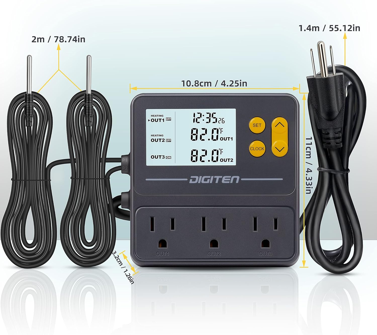 - Easy-to-Use: Timer thermostat for reptiles; Plug-and-play design, 2 temperature controlled outlets with timer and 1 timer outlet are available to be chosen. The temperature controller can regulate and maintain your preferred temperature within a control range from 14~248ºF. There are 2 sensor probes to reliably track the temperature