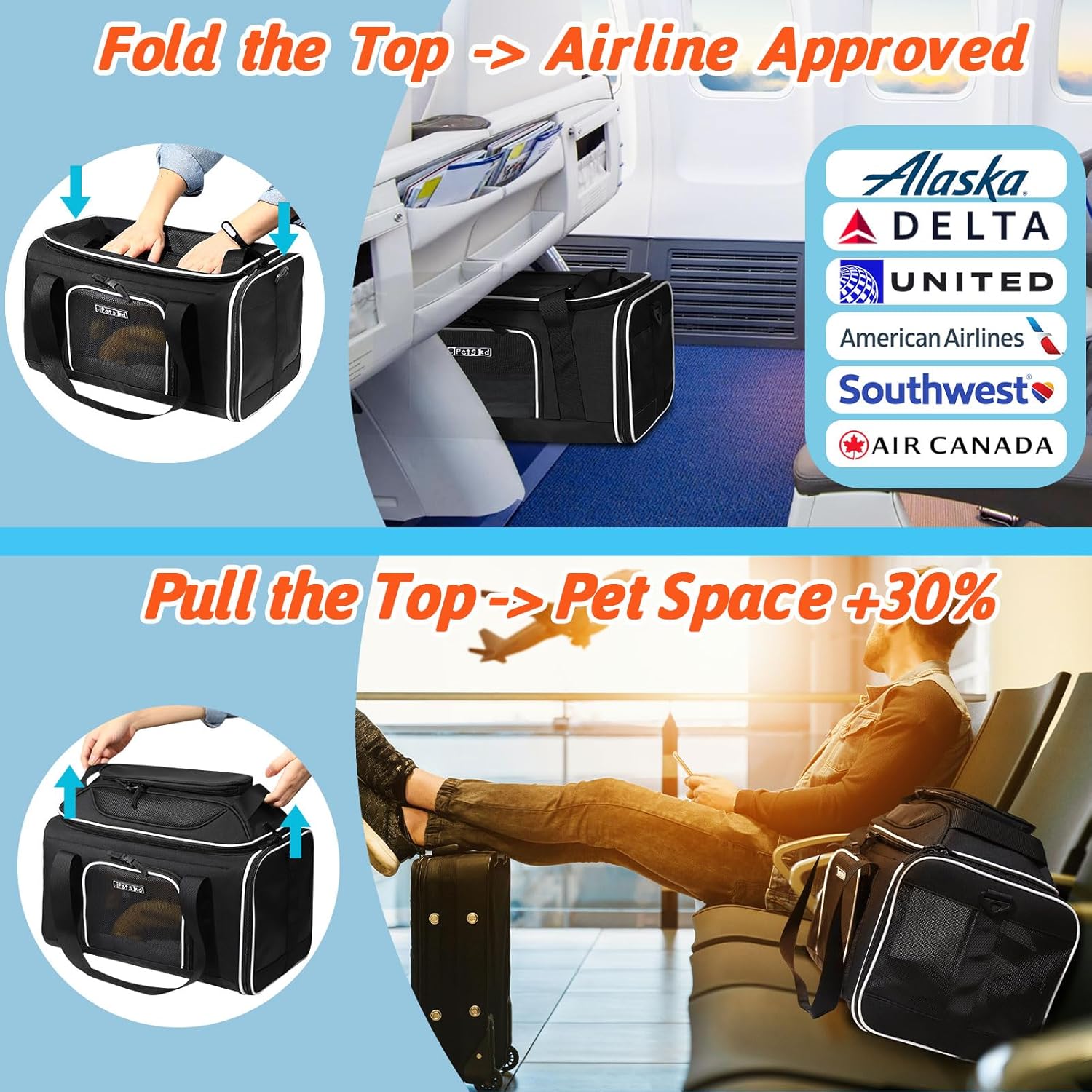 Petskd Top-Expandable Pet Carrier 17x11x9.5 Inches Alaska Airline Approved, Soft-Sided Carrier for Small Cats and Dogs with Locking Safety Zippers and Anti-Scratch Mesh(Black)