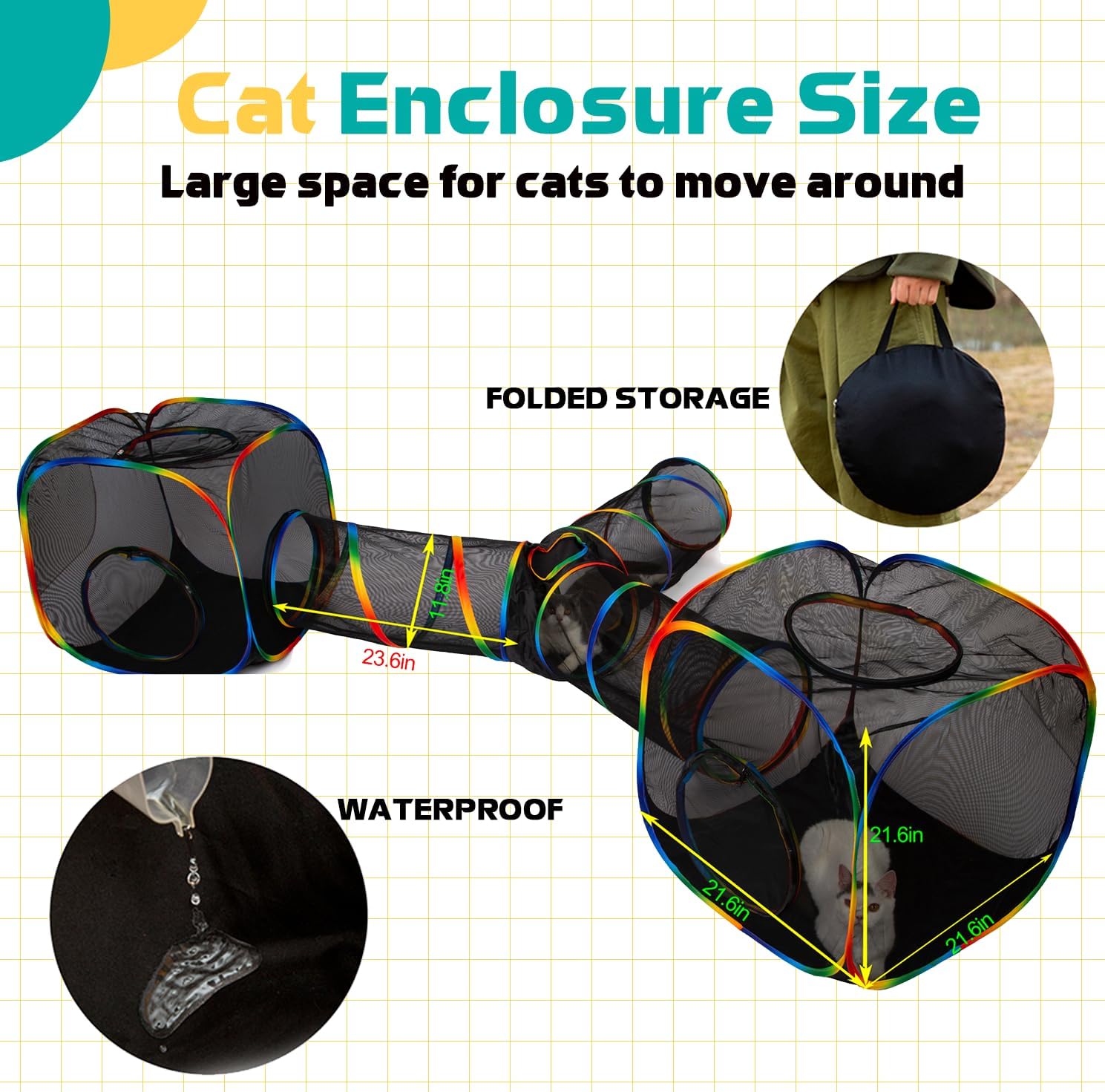 - 🐱Deluxe and Roomy Pet Enclosures - the Cube Dimensions: 22* 22* 22In, the Tunnel Dimensions:3 Ways 12* 35In. With over 15 square feet of activity space, this outdoor Pet Mansion is large enough for multiple cats, rabbits, guinea pigs, ferrets, and other small animals. To maximize playtime, there is plenty of extra space for toys, treats, litter box.