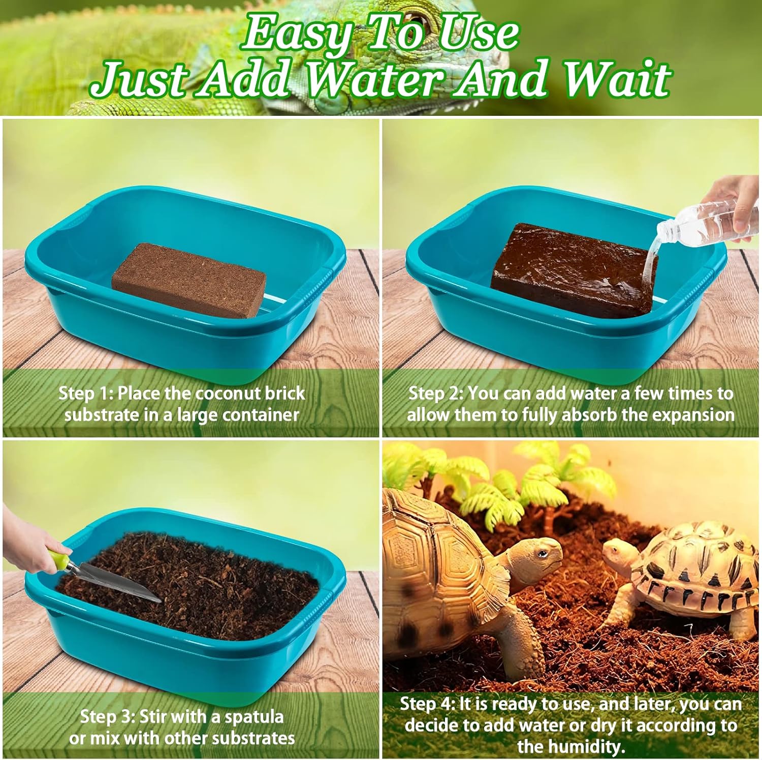 - Easy to Use and Store: These coco bricks are compressed and dense. Just soak the brick in water, coco coir will instantly and easily soak up water and expand into a clean, fluffy substrate. Our Coconut husk fiber is a great substrate for any reptile or amphibian that needs a substrate / bedding that can retain moisture