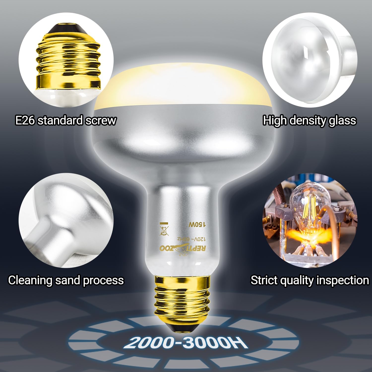 - 【Long Service Life】Adopt updated vacuum aluminizing process technology, the efficiency of the 150W heat lamp bulb increase by 35% and save more energy. Good quality results from upgraded process and the reptile heat lamp can be used over 2000 hours, max 3000 hours.
