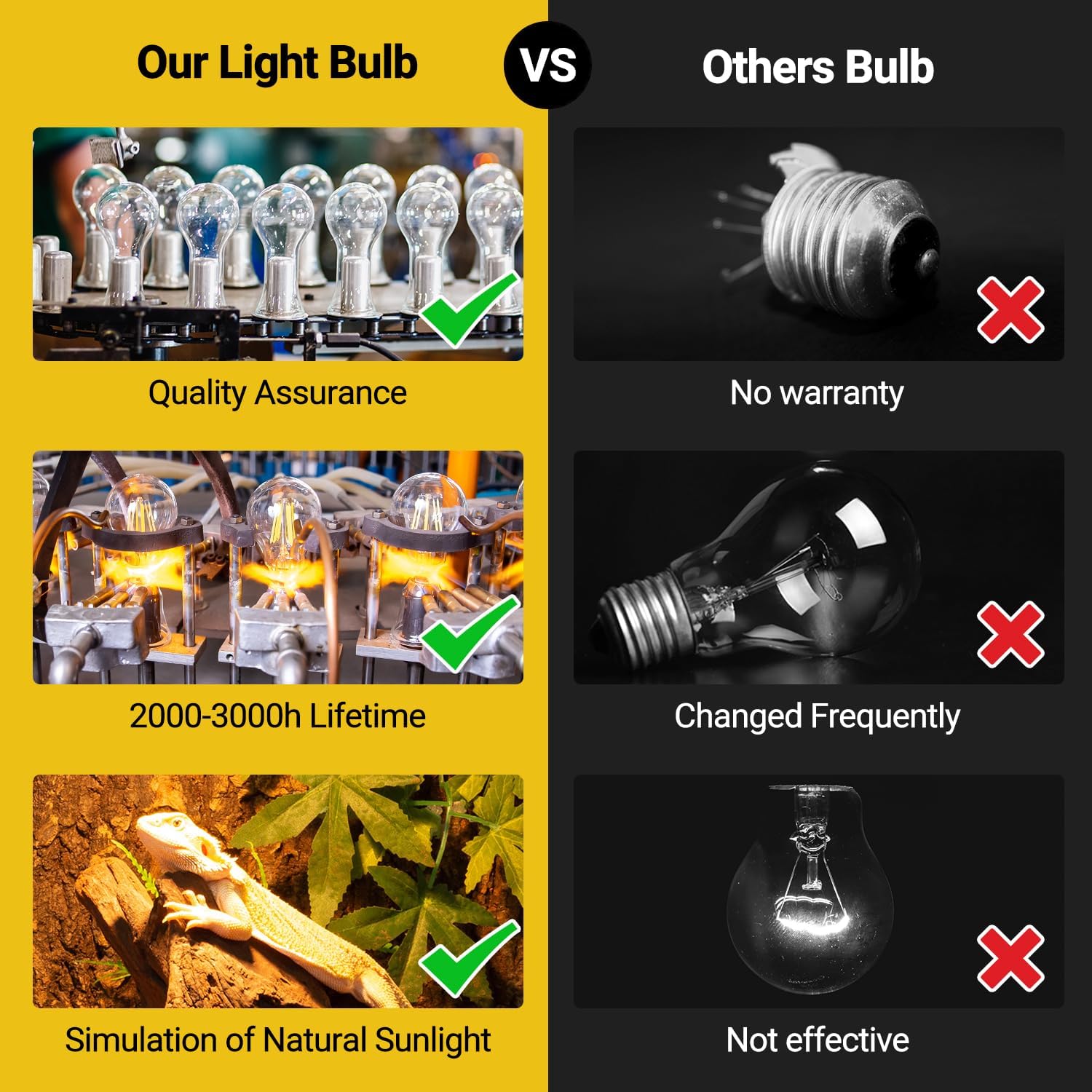 - 【Strict Quality Inspection】Each REPTI ZOO light bulb is strictly tested as 4-stage inspection, appearance inspection, 20 sec lighting test, 30 min aging test and 2 times pulse voltage. We have passed the safety certification to ensure the service life and stability of lamps.