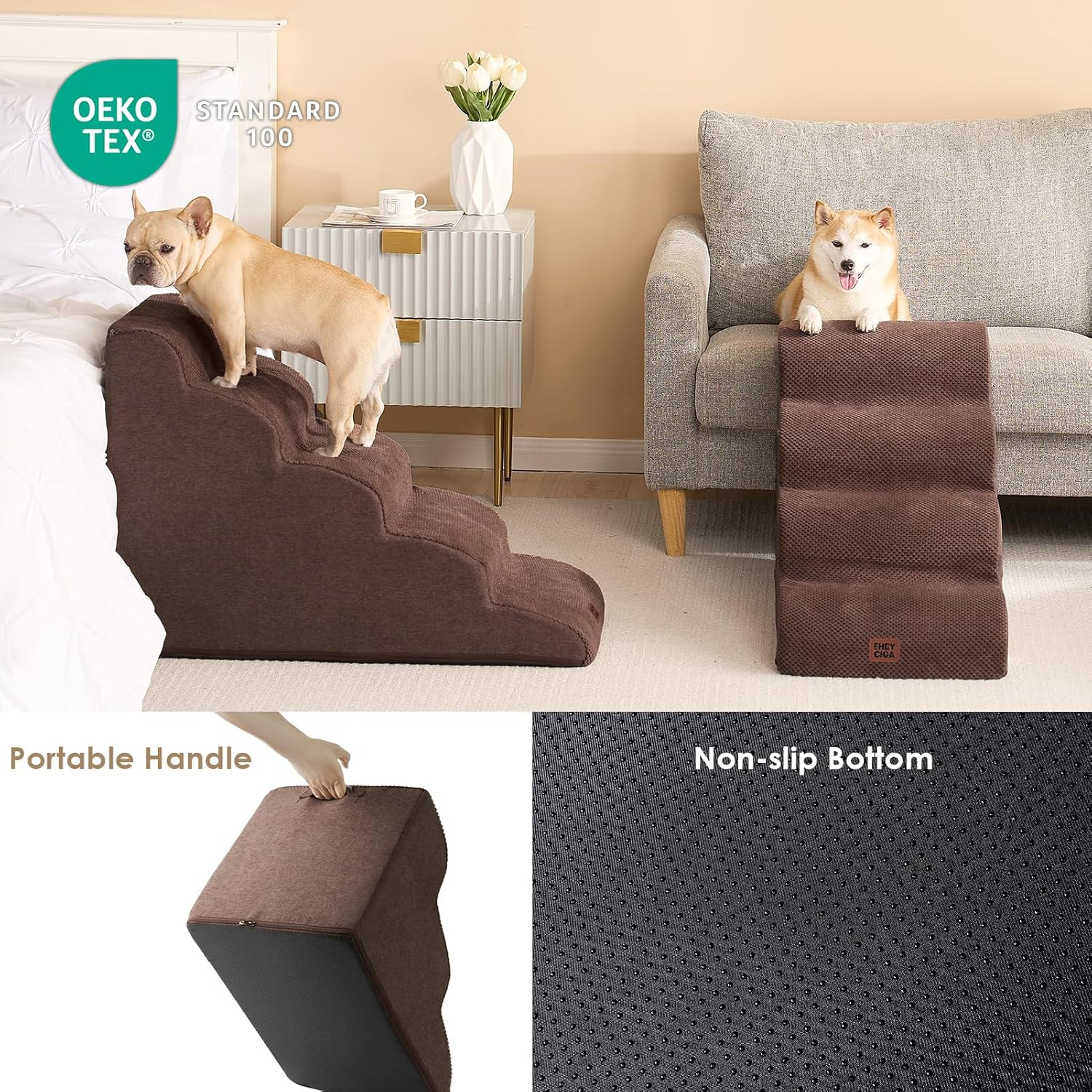 - MULTIPLE STEP SIZES - This dog stair has 2 steps, 3 steps, 4 steps and 5 steps to choose. Our 2-step stairs fits for chair/sofa/bed up to 13inch. 3-step stairs fits for chair/sofa/bed up to 17inch. 4-step stairs fits for chair/sofa/bed up to 21inch. And 5-step stairs fits for chair/sofa/bed up to 24inch.