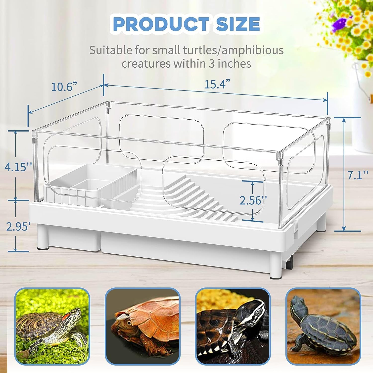 - 【Compact Tank & Easy to Install】Tank size 15.4” x 10.6” x 7.1”. Maximum water level: 2.56’’. Perfect for small turtles, crabs and other small reptiles within 3.0’’. The installation is an easy job with our manual inside the pack!