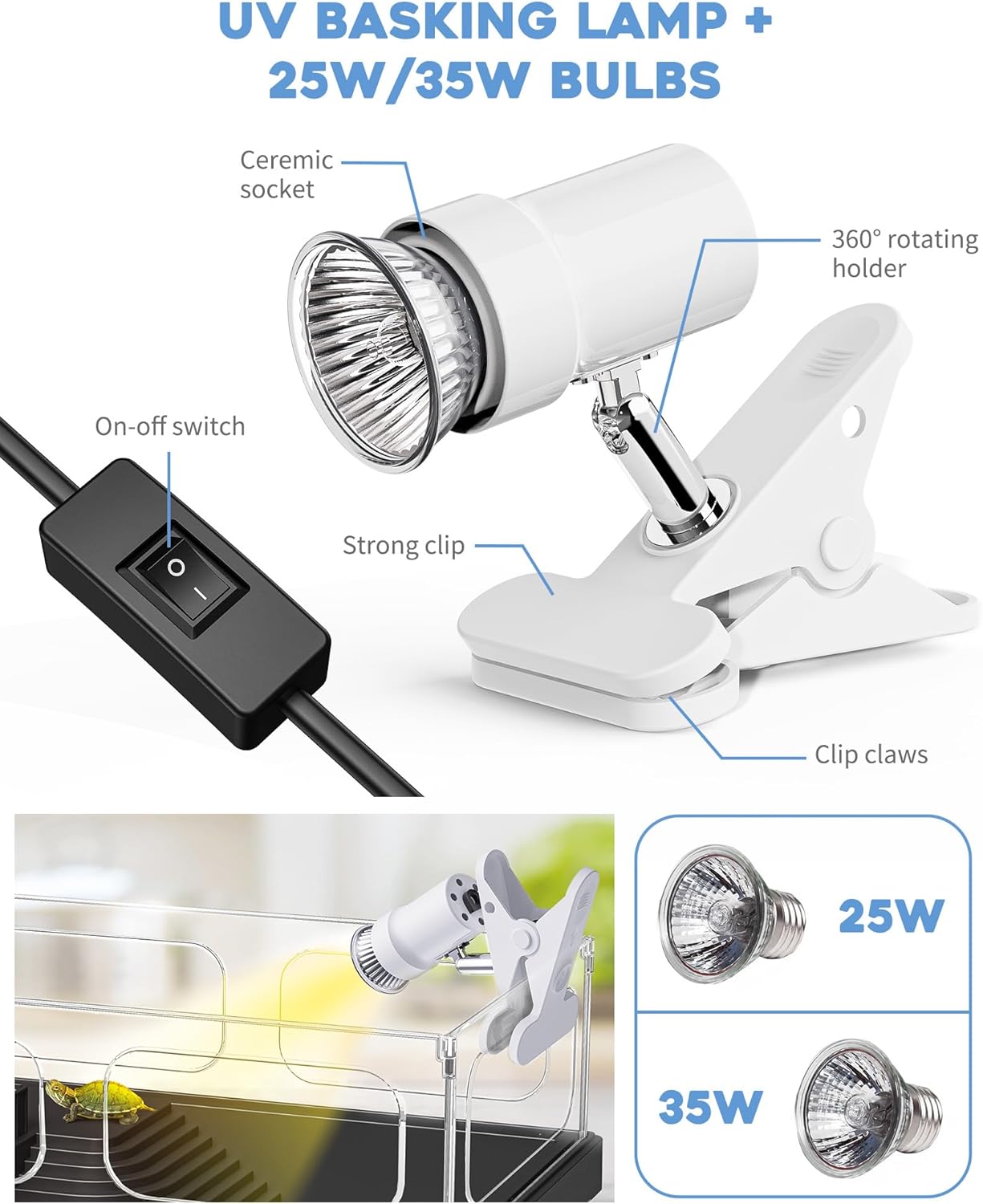- 【UVA/UVB Basking Lamp + 25W/35W Bulbs】Turtles need to bask in the sunshine everyday 1-2 hours for metabolism, mood regulation, breeding, etc. 25W/35W Bulbs provide best warmth within distance of 10’’ to 15’’. They’re perfect for this small tank, not too hot not too cold.