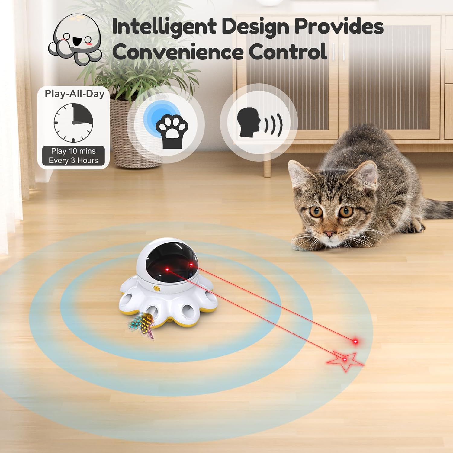 - 【2-in-1 Cat Laser Toys】Unique dot and star double laser patterns, combined with automatic 360°random laser trajectory of Fast, Medium and Slow lasers, unpredictable movement stimulates cats to chase and play. Feathers shoot out randomly from 8 holes, encouraging your cat to pounce and flap. Perfectly match various scenarios, no need to worry about indoor cat hit anything that might fall or break.