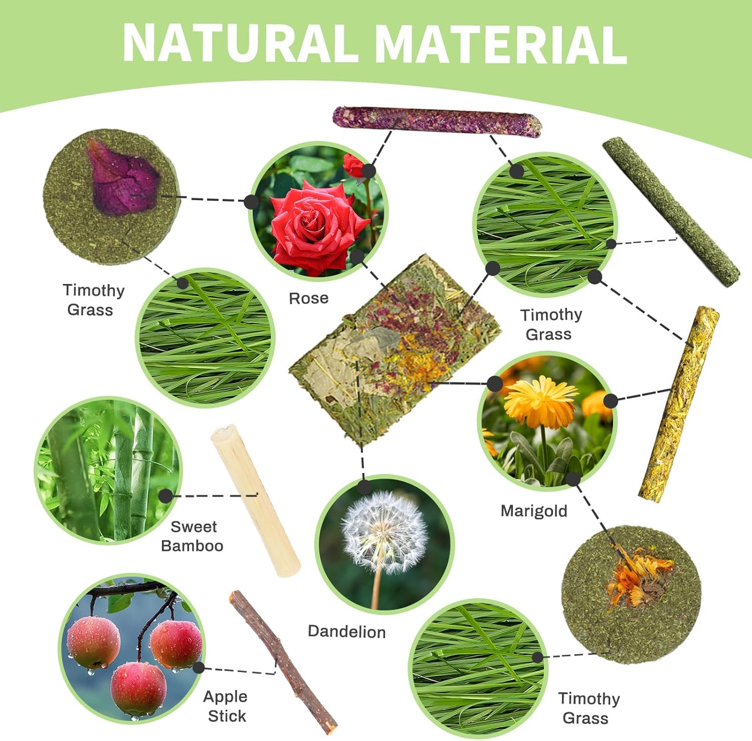 - 【Multiple Chewing Varieties for Guinea Pig Chew Toys】This guinea pig chew toys offers a variety of teething types made of different materials, each with a unique teething action and texture to meet your guinea pig's different teething needs and taste preferences. Natural materials such as Dandelion, Timothy Grass, Sweet Bamboo and Apple Twigs with their various flavors attract pets to chew and grind their teeth better and effectively exercise the chewing muscles of pets.