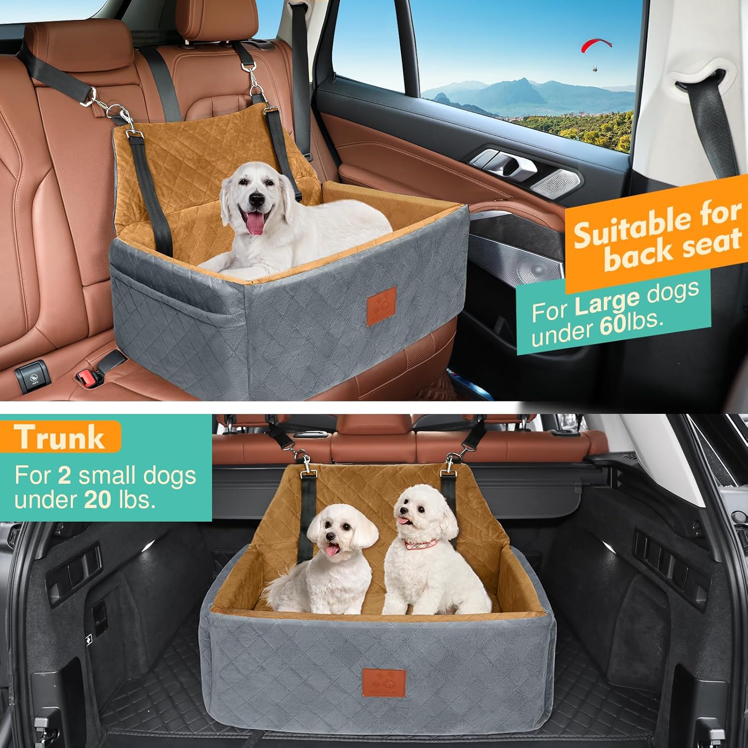 - 【Dog Car Booster Seat】With a 4.3inch thick foam cushion, the dog carseat's booster design gives your pet a better view out the window, helping to ease their anxiety during car rides,plus It comes with two adjustable safety leashes that can be attached to your dog's harness to prevent them from jumping out the window, allowing your dog to enjoy the ride without worrying that it will interfere with your driving