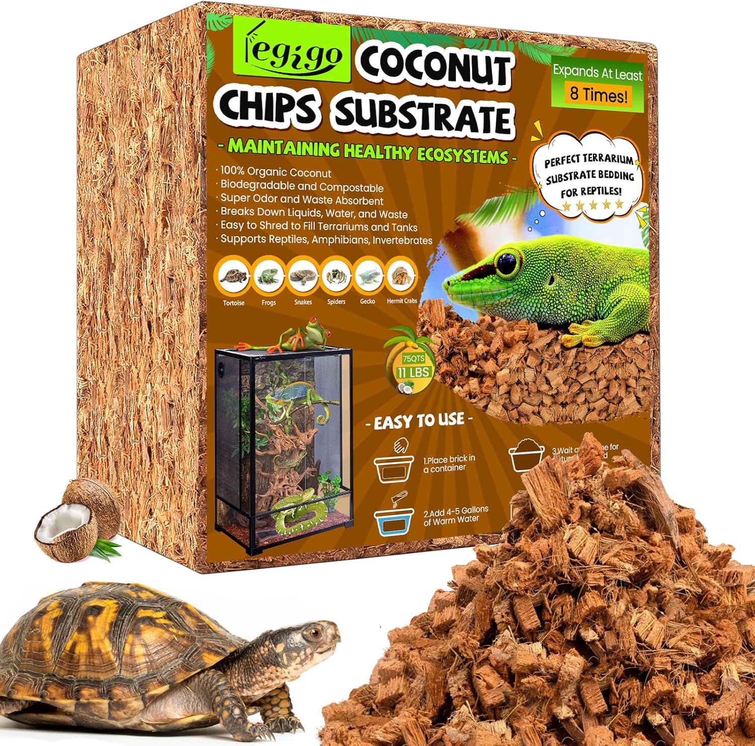 Legigo 10LBS Coconut Chip Substrate for Reptiles, 72QT Natural Coco Husk Chip Reptiles Bedding, Compressed Coconut Chip Substrate for Snake, Tortoise, Ball Python, Gecko, Lizard Terrarium Tanks