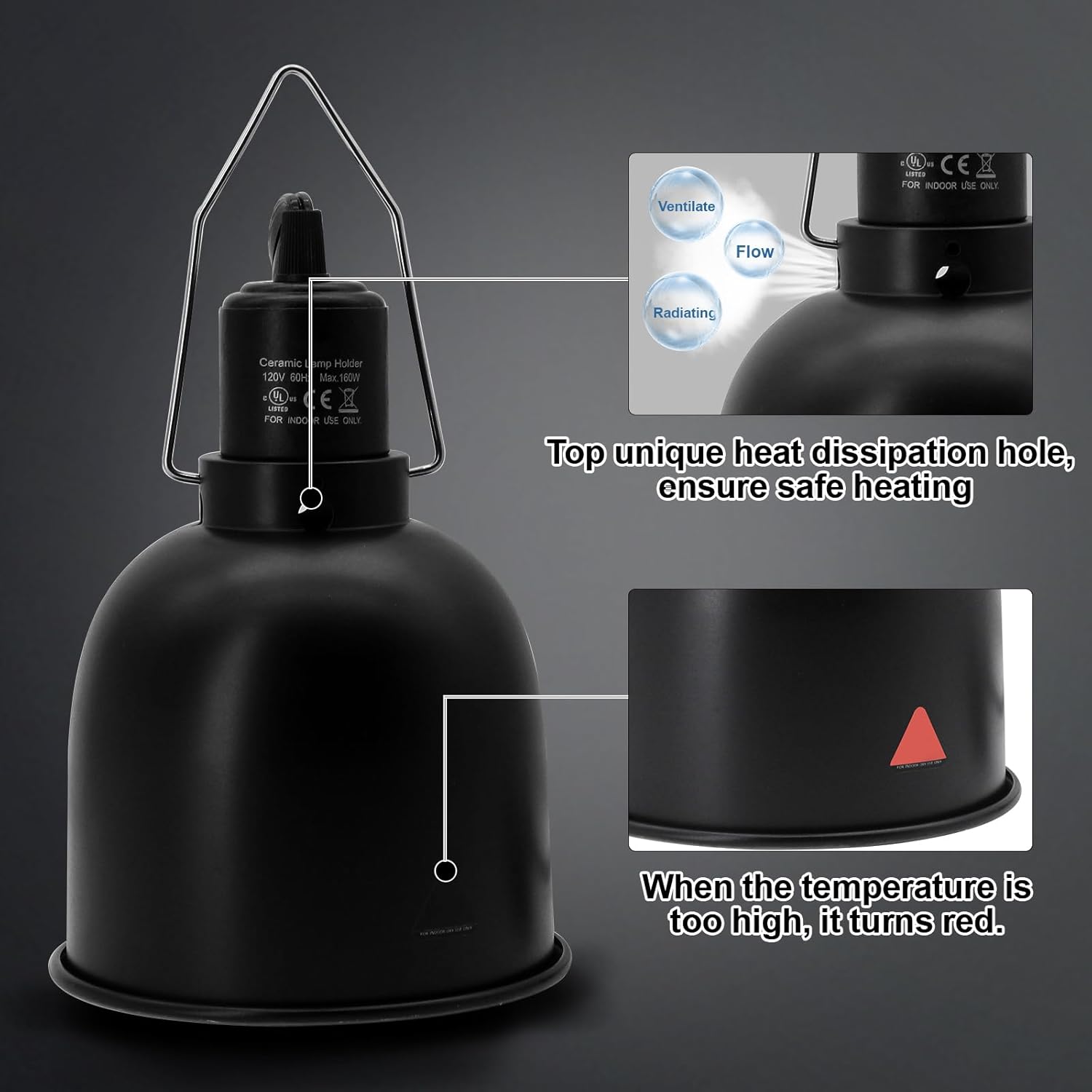 - Portable Hook - The sturdy and heat-resistant E26 ceramic lamp head ensures long-term use and can withstand up to 160W. The stainless steel hook at the top works with any reptile lamp stand and remains stable.