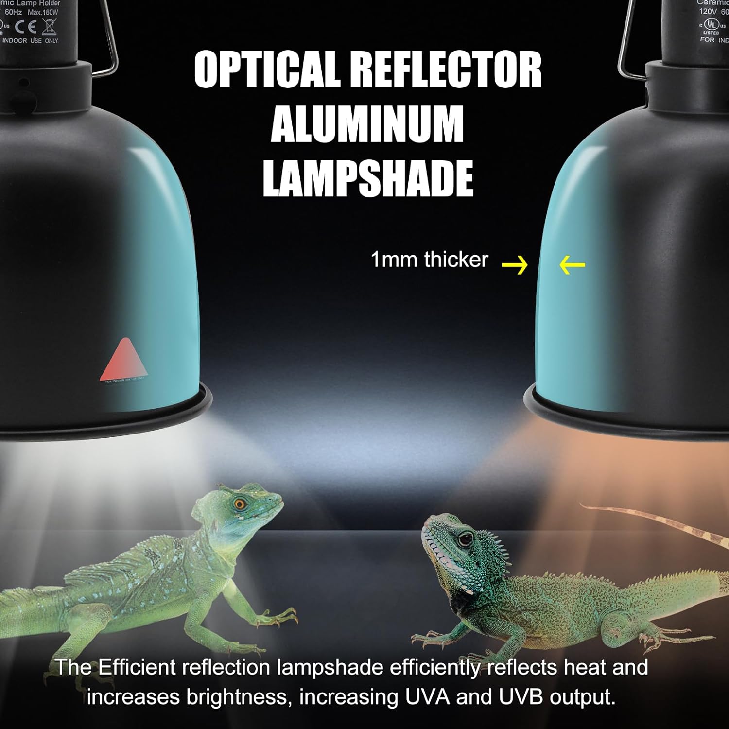 - Great Aluminum & High Reflection - Our dimmable lampshade is made of high-quality aluminum, and the inside of the lampshade is finely polished to effectively reflect heat and increase brightness, which can significantly increase UVA and UVB output. The thickness of the lamp wall is 1mm, ensuring it has better high temperature resistance and is not easily deformed.