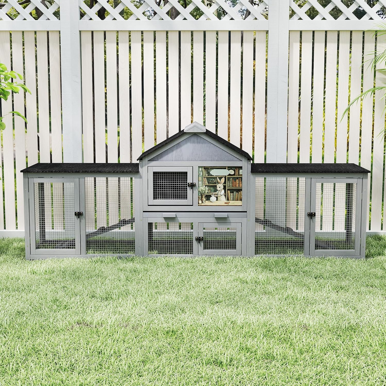 - Spacious & Safe:Our 82-inch-long oversized double-decker wooden rabbit cage outdoor has three spaces to move around on the first floor, with skateboards on both sides to ensure the safety of your rabbit, and the second floor can rest to avoid outside disturbances and provide a comfortable environment for your pet baby.