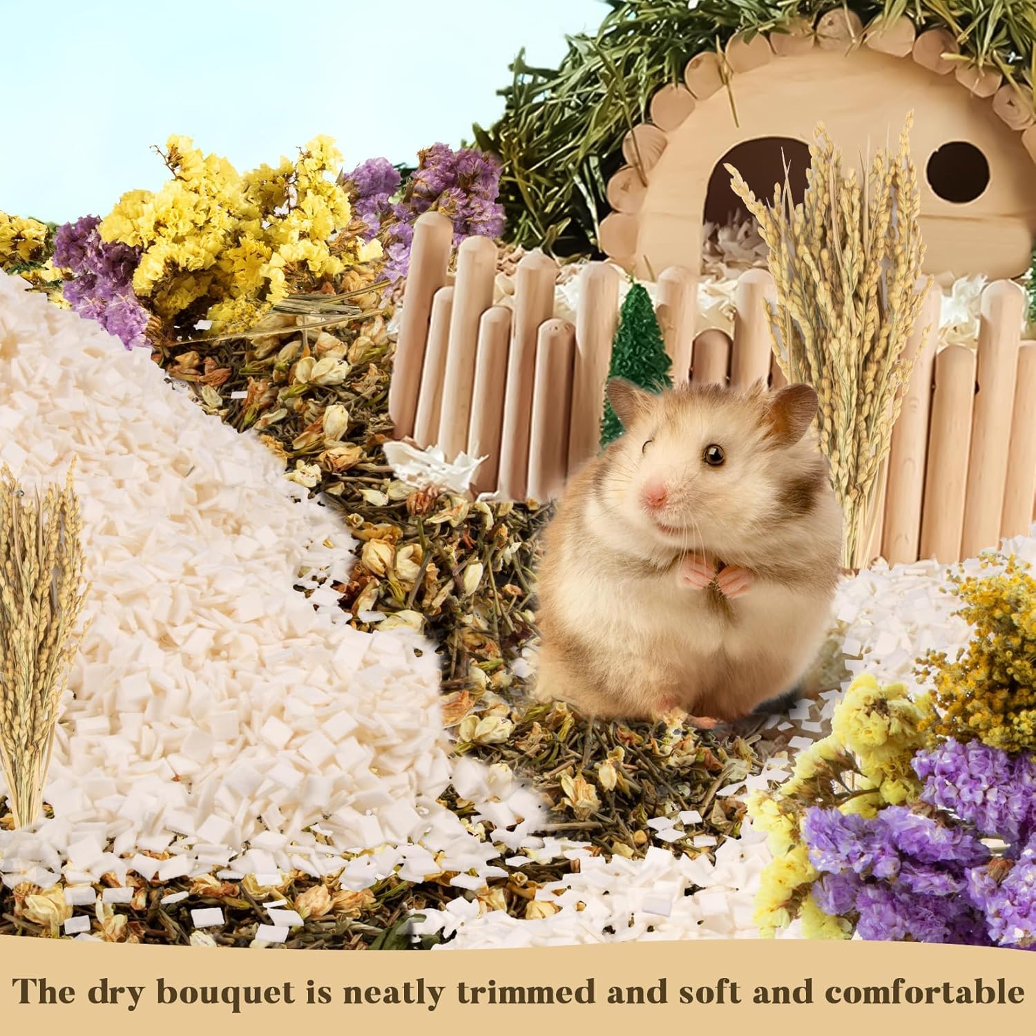 - Harvest Flowers: Nature flower herb Hamster Bedding mate is a beautiful pop of color in hamster bedding. Beautiful hamster spray is carefully selected,no additives and neatly trimmed branches, perfect for hamster bedding and nest