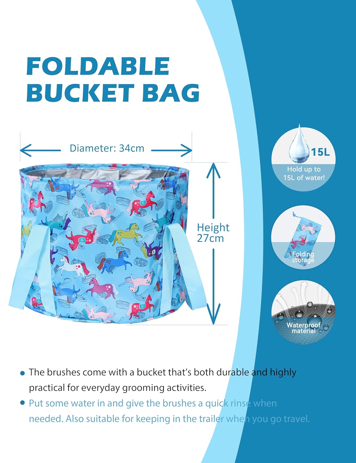 - Portable Water Bucket: The horse grooming set comes with a foldable tote bag that not only neatly stores all the brushes but also doubles as a mobile water bucket. This convenient feature allows for quick cleaning of brushes or your horse, eliminating the need to carry a separate bucket for on-the-go grooming.