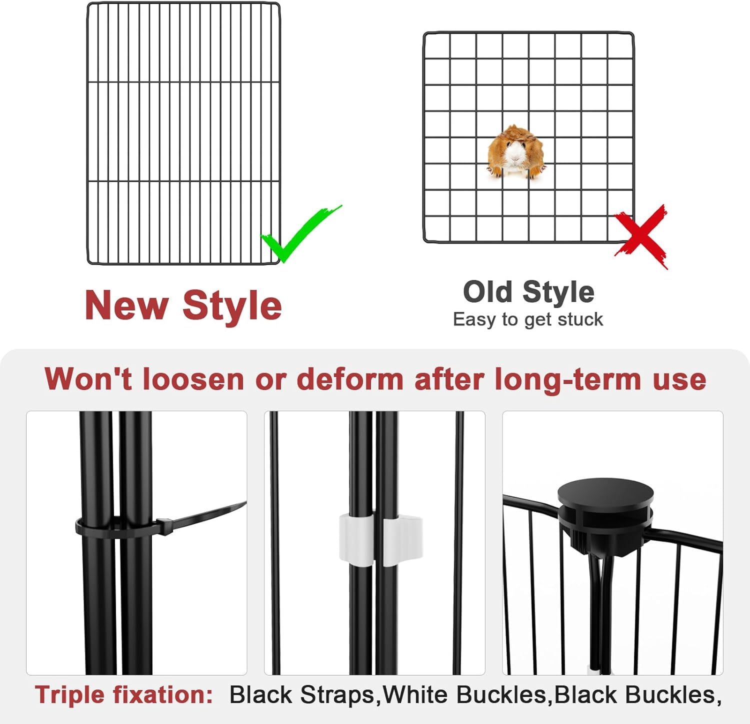- Triple Fixing Measures: Black buckles, white buckles, and black straps are all used to connect each panel. Different accessories provide stability from the bottom to the top of the guinea pig habitat. The installation is very simple, which a 5-year-old kid can assemble it (with instructions included). 50 black straps can be reused in areas you think need reinforcement.