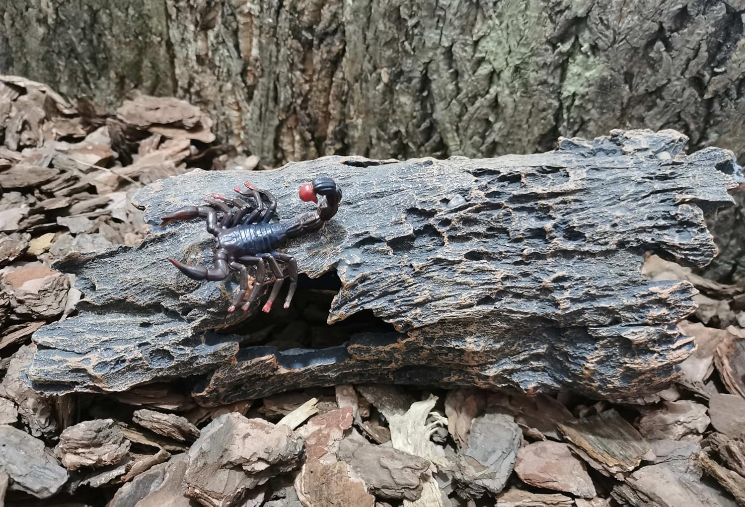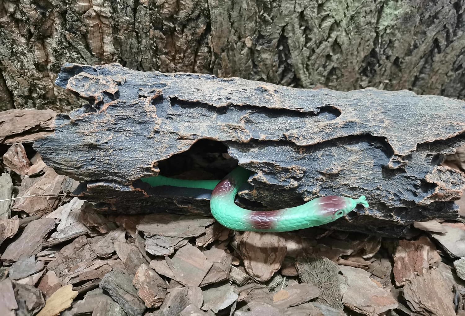- 1.The design inspiration comes from nature. Simulated resin bark texture reptile hides is your first choice for reptile tank accessories.The natural colors and realistic bark textures create an original ecological living environment for reptiles.Young ball pythons , corn snakes and hamsters can hide in it or move through it.It's a bit small for an adult ball python. It can also be used as fish tank accessories,allowing your little fish and shrimp to happily hide and swim around.