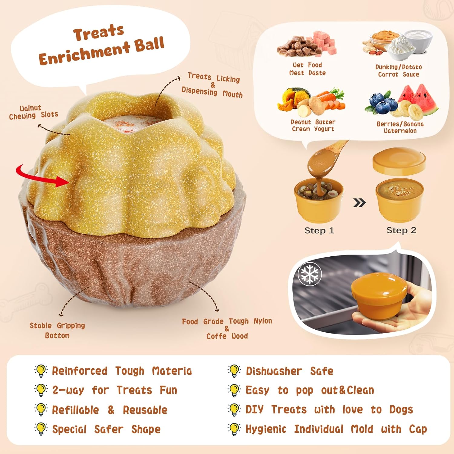 - 【Dog Treats Rewarding Toy】Incredible walnut design can catch and brighten your dog’s eyes and brings them super excitement. You can also feed the ice tray with the main dog food, for delicious frozen treats will keep them busy for 30 minutes or more! Absolutely help them to cool down after every go out in hot summer.
