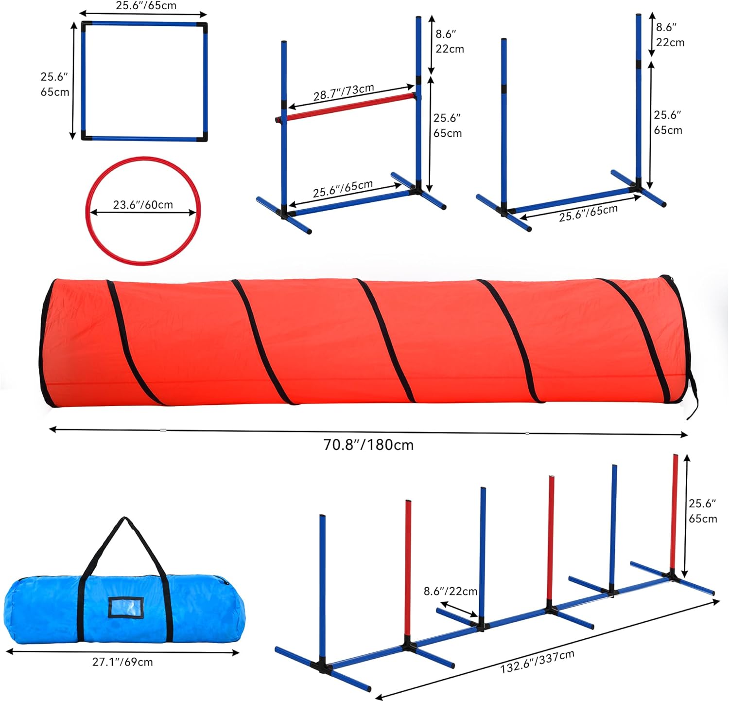 - No Tool Setup, Easy Portability: Made from Oxford cloth, PVC, and durable steel, the dog agility equipment assembles easily without tools; Three carry bags keep everything organized and help make it simple to transport between indoor and outdoor sessions