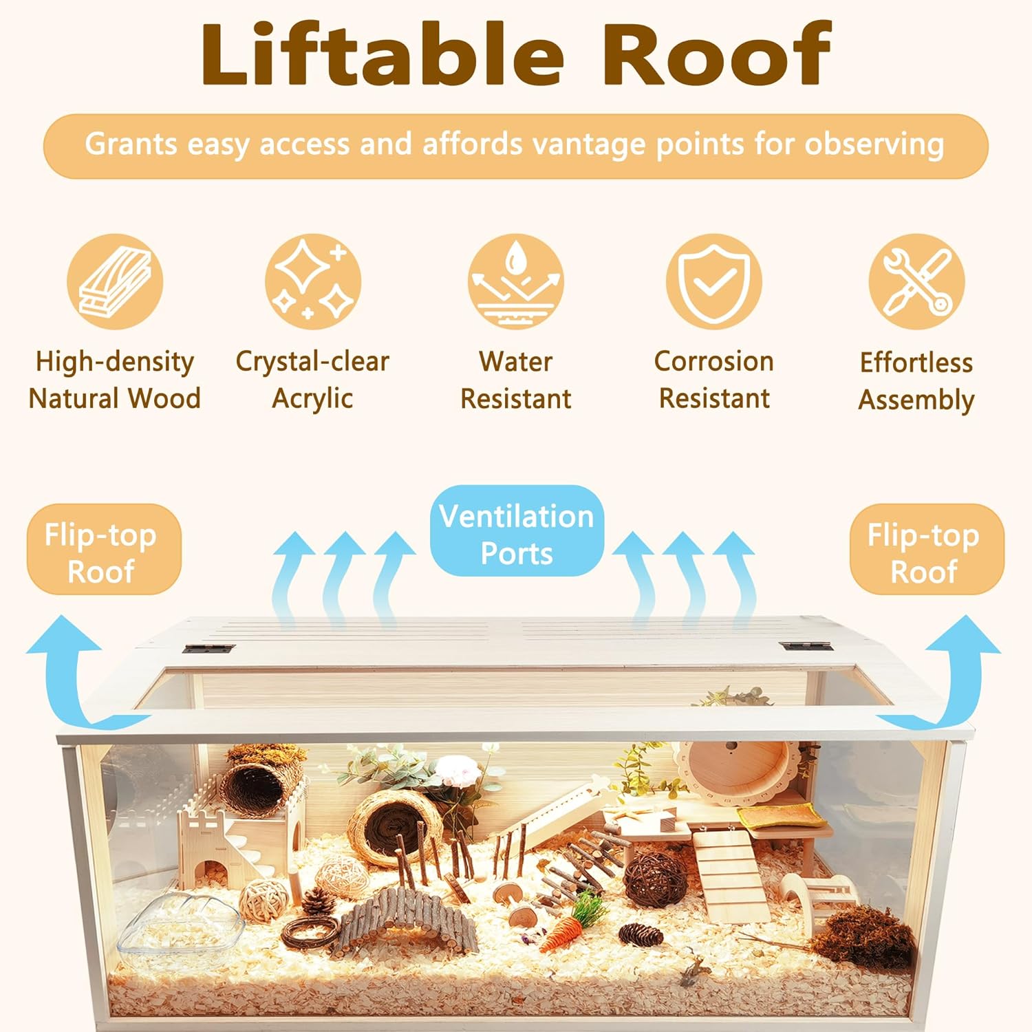 - 【High-Quality Materials】Available in 4 sizes ranging from 24 to 48 inches in length, with 24-27.5 inches legs height, please refer to picture 3 for size information. Crafted from durable, high-density natural wood treated with a rot-resistant, waterproof coating, our cage ensures longevity and aesthetic appeal. Transparent acrylic panels provide a clear view of your cherished hamsters' activities. An additional acrylic sheet on the cage bottom prevents moisture buildup, simplifying cleaning tasks.