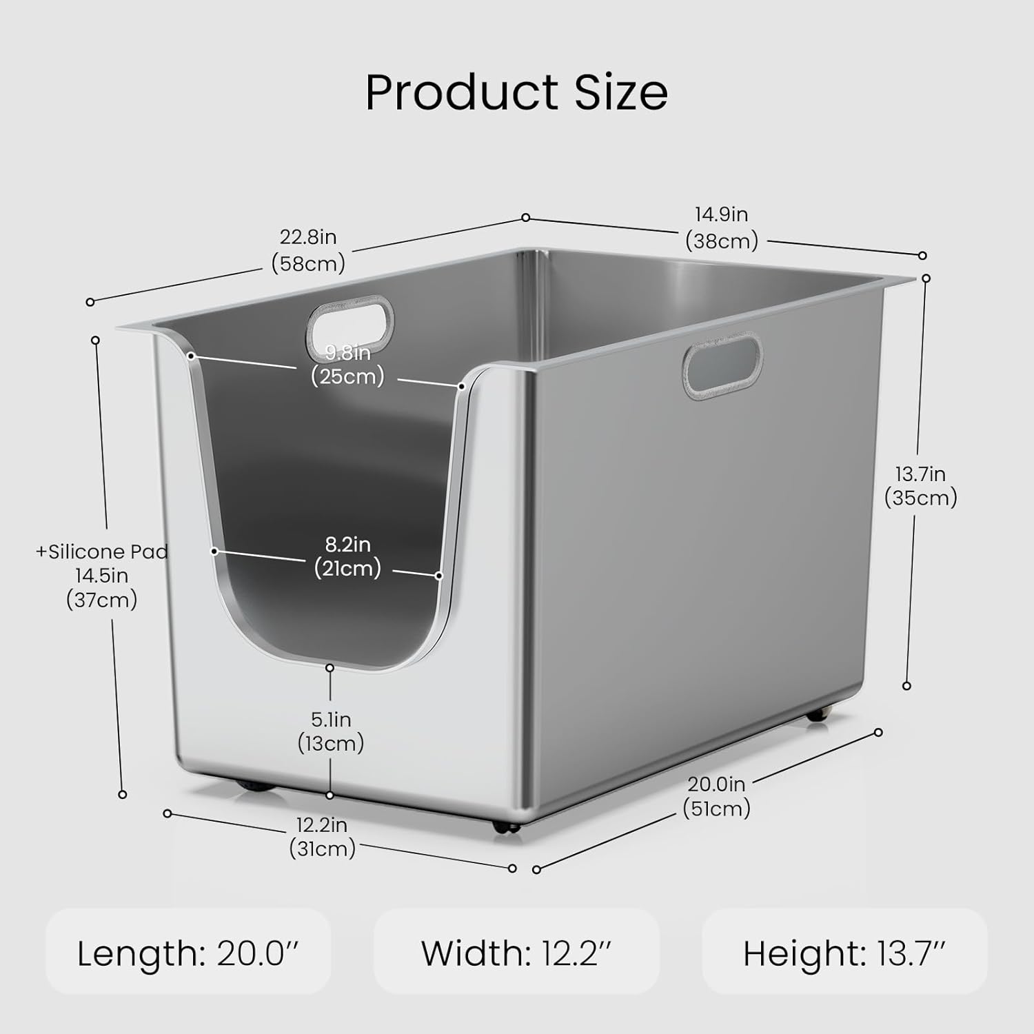 - XL Stainless Steel Litter Box: The extra large size of 20"*12.2"*13.7" allows cats to turn around inside. It's ideal for multi-cat households and large enough space for cats, rabbits, hamsters and other pets, providing peace of mind for you. The curved low entry is designed for easy access by kittens just learning to toilet, elderly cats, fat cats and infirm cat