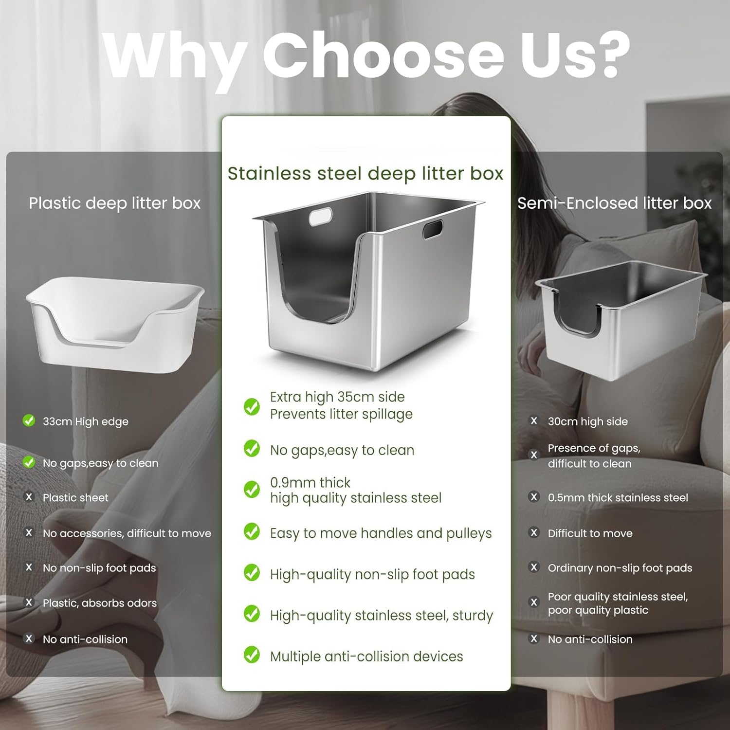 - All Metal Litter Box: Crafted from full stainless steel, rust-resistant, odor-free and non-stick, this high sided litter box boasts 13.7" high sides deep litter box design that prevents cats from kicking litter out of the cat box. One-Piece Stainless Steel cat litter box large for big cats effectively keeps cat urine from leaking and is friendly for high peeing cat