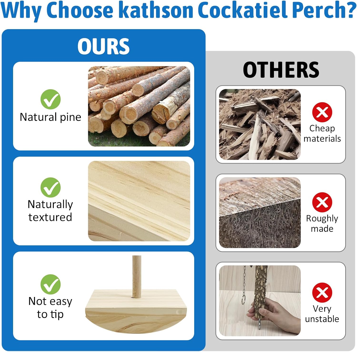 - NATURAL MATERIALS: Our bird perches is made of pine and pepper wood; it is bird-friendly; the surface of the T-bracket is uneven; it has a natural texture; it is suitable for birds to sharpen their claws and beaks; the T-bracket is securely fastened to the base by metal screws; it ensures the stability of the overall structure; we have also adopted a hidden screw design; there is no unsafe place for chewing on the whole bird stand; it will not be unsafe for pets