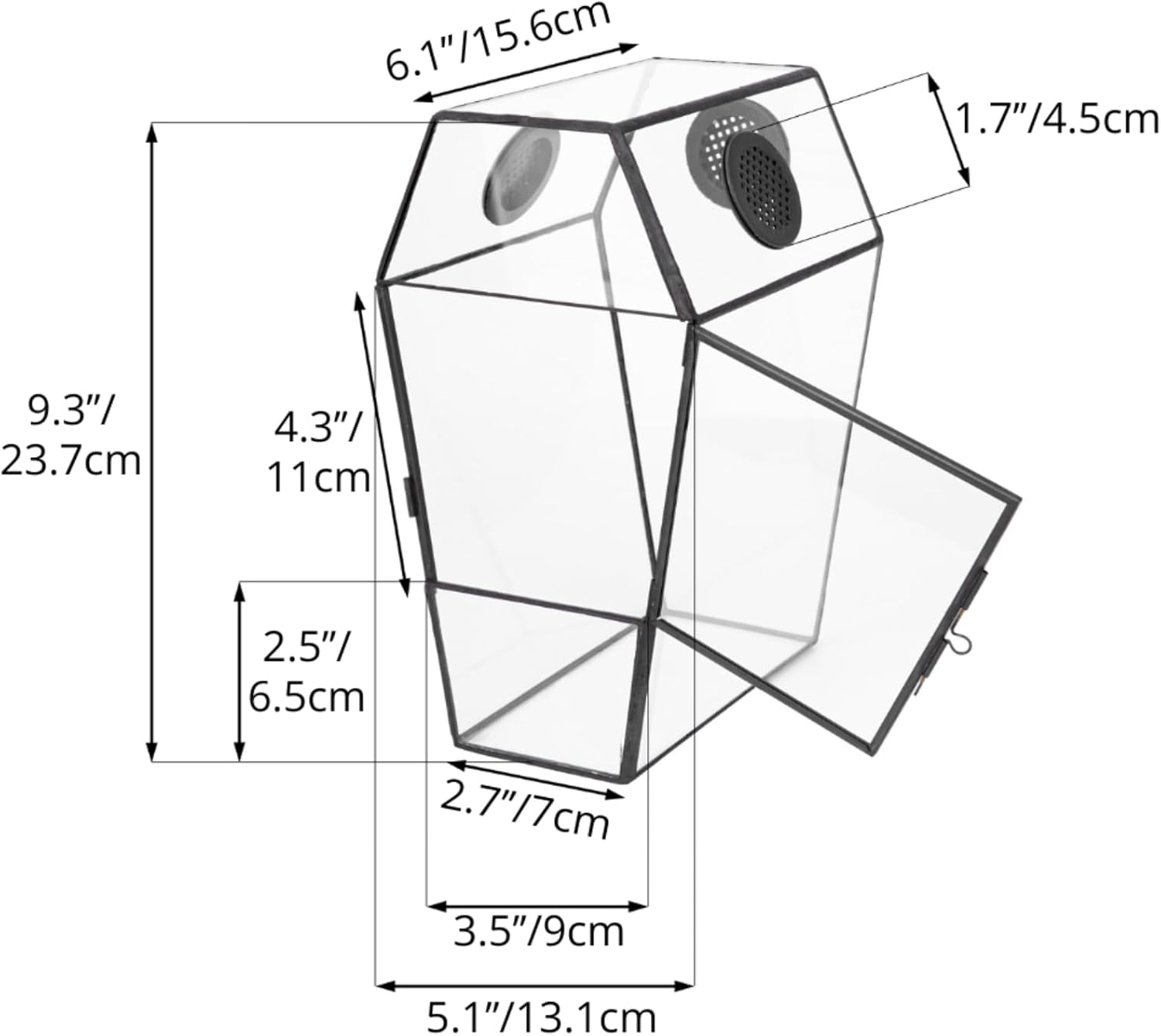 - This is an insect terrarium in a unique coffin-shape with 3 black plastic mesh vents on the roof. It is a perfect enclosure choice for insects like jumping spiders and snails