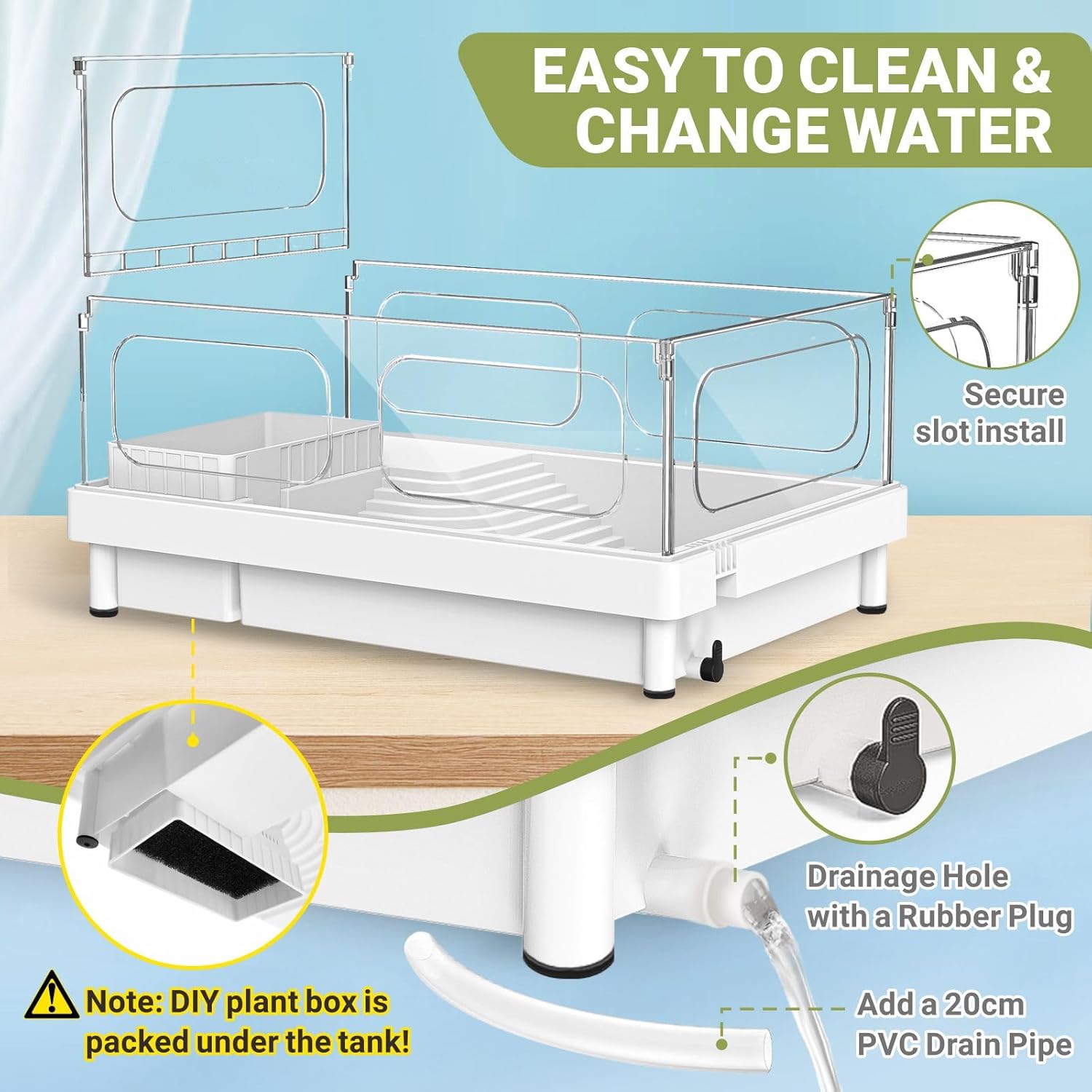 - 【EASY TO USE AND CLEAN】Keep your turtle tank clean and hassle-free with bottom drainage feature. Simply drain the water, remove debris, and refill for a healthier habitat. There is a DIY plant box is packed under the tank, you can use our included colored stones and trees to decor the landscape of the turtle aquarium.
