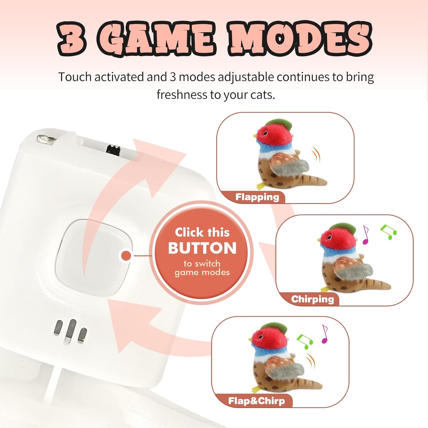 - Multiple Fun:The exterior of the toy is made of soft, safe and bite-resistant plush for your kitten to chew and play. Comes with an extra bag of catnip as a replacement, which can be put into the pheasant's belly to emit scent and enhance the appeal to kittens. 3 adjustable modes:flap, chirp, flap and chirp, which continues to bring freshness to the kitten