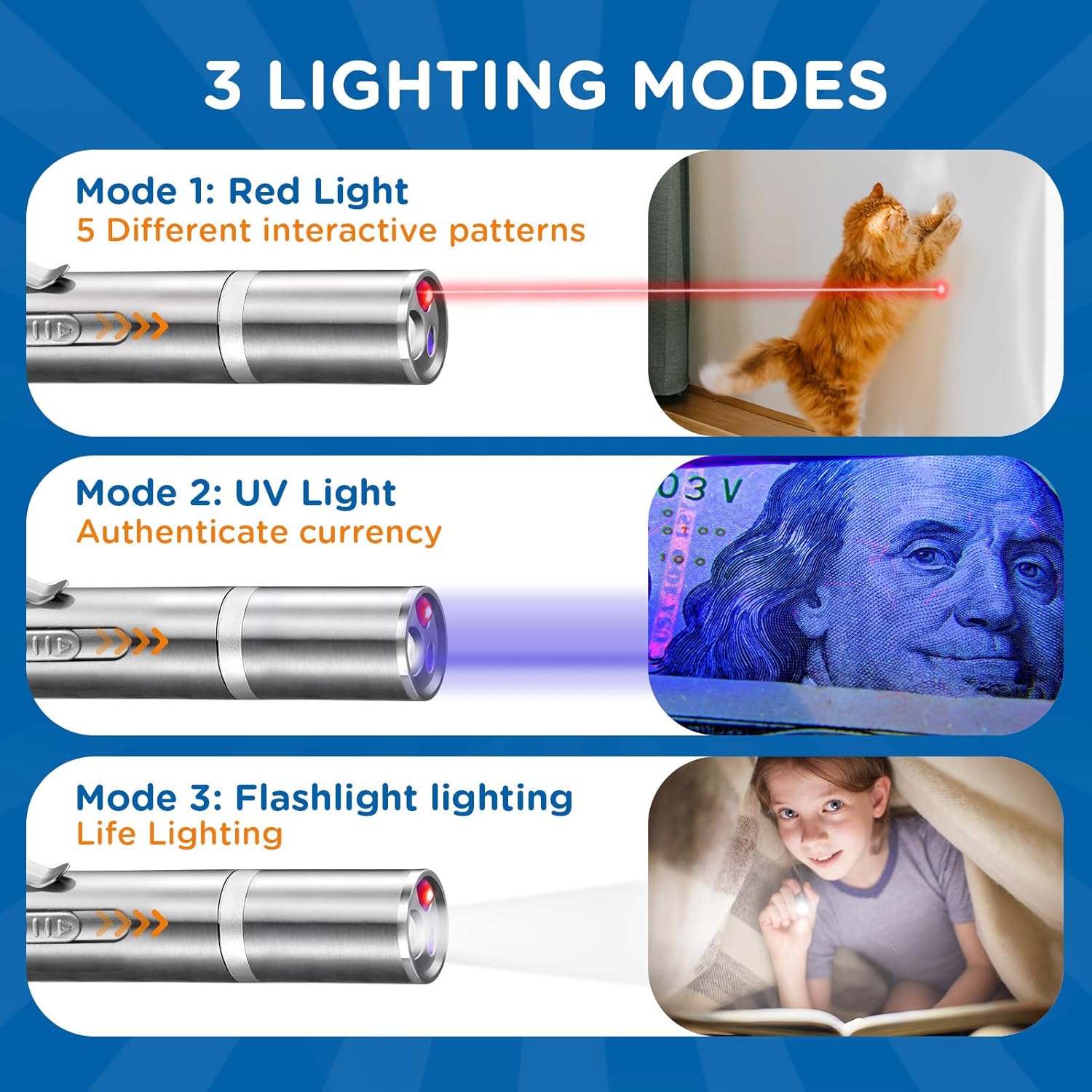 - 3 Light Colors Pet Toys: This Cat flashlight comes with red, purple, white mode for your pets. There are also five different pattern configurations. Don't worry your pet will get bored with this toy soon! Come and explore the fun of this toy!