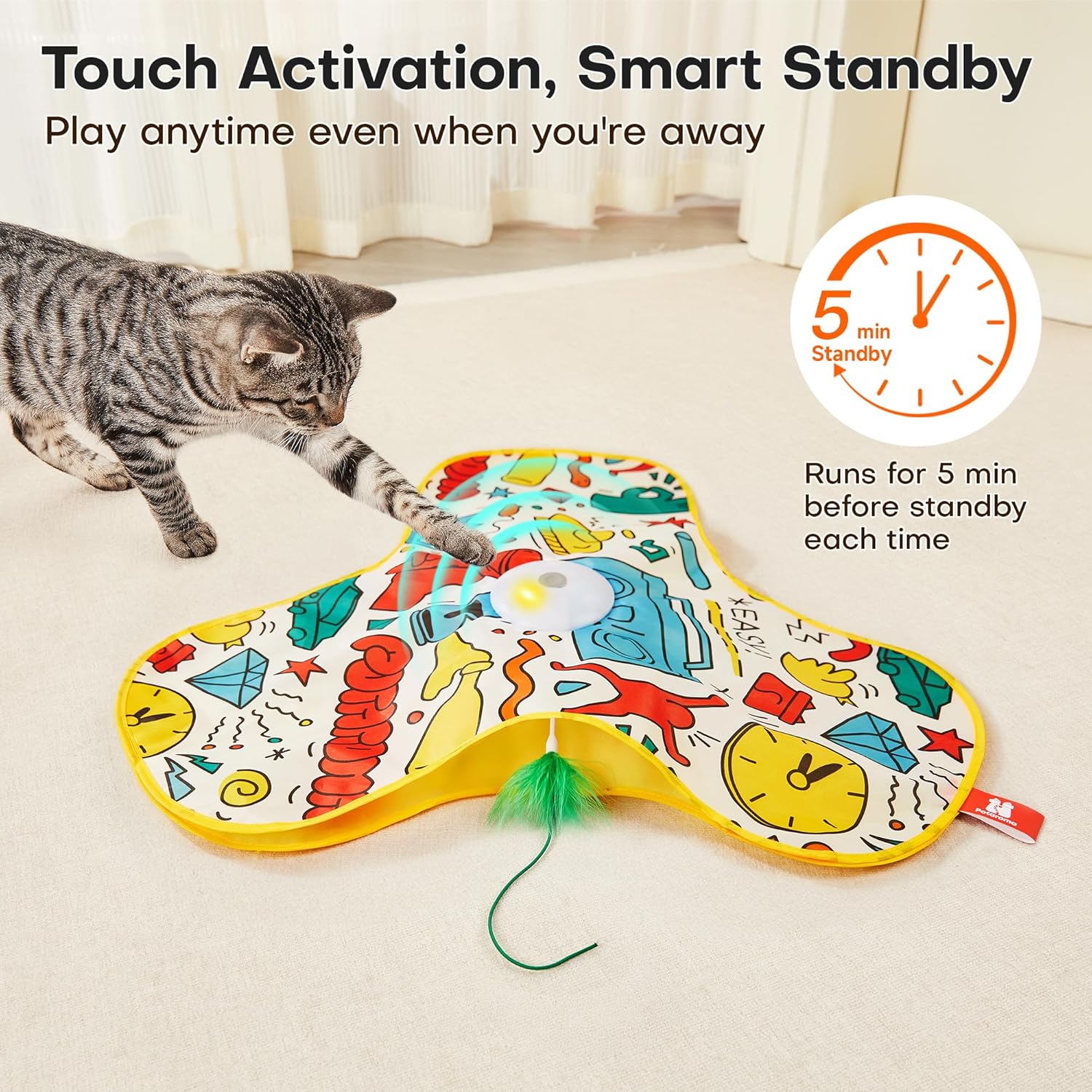 - Durable & Safe Design – The thickened, double-padded mat ensures durability during enthusiastic play, while the easily replaceable feather wand adds to the toy’s longevity. This motorized entertainment buster offers endless chase opportunities for your kitty, making it a must-have for households with high-energy or easily bored cats.