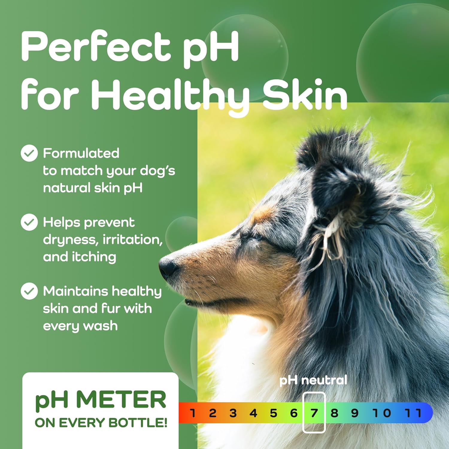 - pH-Balanced for Skin Health – Featuring a built-in pH meter right on the bottle, this shampoo for dogs ensures every wash is balanced for skin wellness. Proper pH supports the natural skin barrier and makes this a trusted choice for itchy dog shampoo needs and long-term coat care.